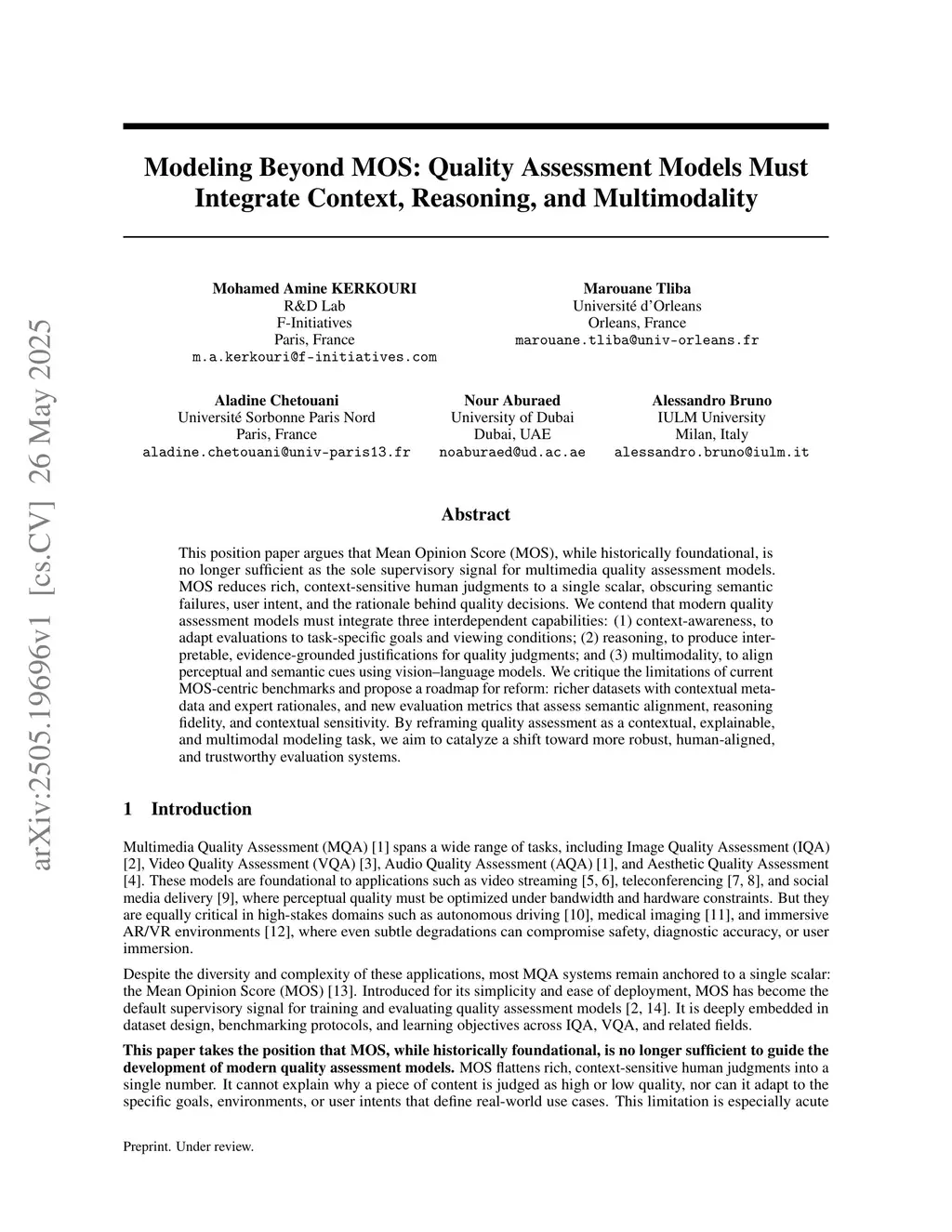 This position paper argues that Mean Opinion Score (MOS), while historically foundational, is no longer sufficient as the sole supervisory signal for multimedia quality assessment models. MOS reduces rich, context-sensitive human judgments to a single scalar, obscuring semantic failures, user intent, and the rationale behind quality decisions. We contend that modern quality assessment models must integrate three interdependent capabilities: (1) context-awareness, to adapt evaluations to task-specific goals and viewing conditions; (2) reasoning, to produce interpretable, evidence-grounded justifications for quality judgments; and (3) multimodality, to align perceptual and semantic cues using vision-language models. We critique the limitations of current MOS-centric benchmarks and propose a roadmap for reform: richer datasets with contextual metadata and expert rationales, and new evaluation metrics that assess semantic alignment, reasoning fidelity, and contextual sensitivity. By reframing quality assessment as a contextual, explainable, and multimodal modeling task, we aim to catalyze a shift toward more robust, human-aligned, and trustworthy evaluation systems.