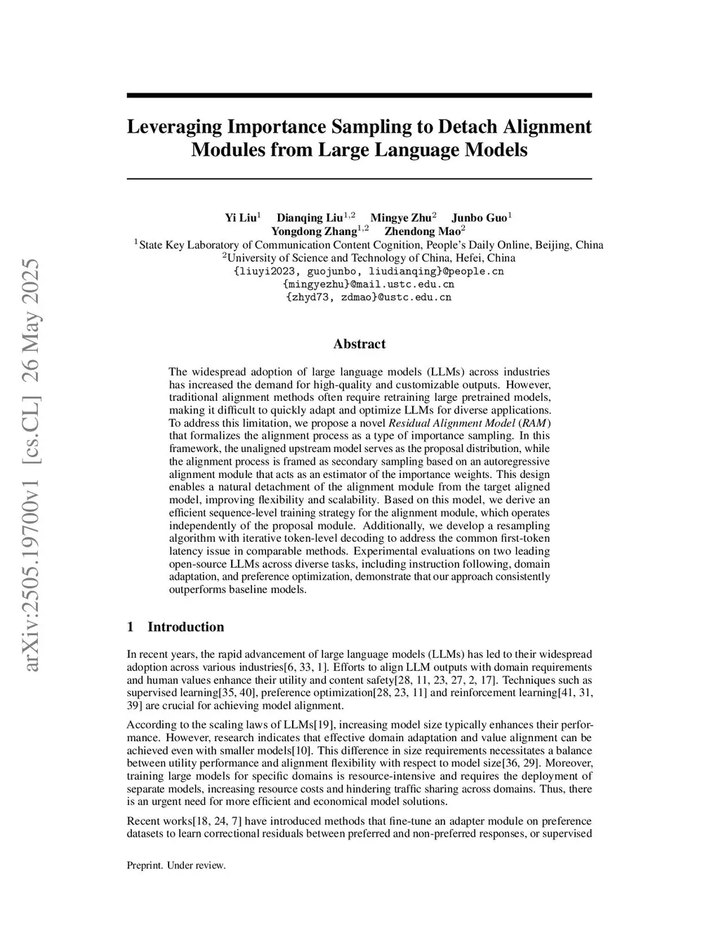 The widespread adoption of large language models (LLMs) across industries has increased the demand for high-quality and customizable outputs. However, traditional alignment methods often require retraining large pretrained models, making it difficult to quickly adapt and optimize LLMs for diverse applications. To address this limitation, we propose a novel \textit{Residual Alignment Model} (\textit{RAM}) that formalizes the alignment process as a type of importance sampling. In this framework, the unaligned upstream model serves as the proposal distribution, while the alignment process is framed as secondary sampling based on an autoregressive alignment module that acts as an estimator of the importance weights. This design enables a natural detachment of the alignment module from the target aligned model, improving flexibility and scalability. Based on this model, we derive an efficient sequence-level training strategy for the alignment module, which operates independently of the proposal module. Additionally, we develop a resampling algorithm with iterative token-level decoding to address the common first-token latency issue in comparable methods. Experimental evaluations on two leading open-source LLMs across diverse tasks, including instruction following, domain adaptation, and preference optimization, demonstrate that our approach consistently outperforms baseline models.