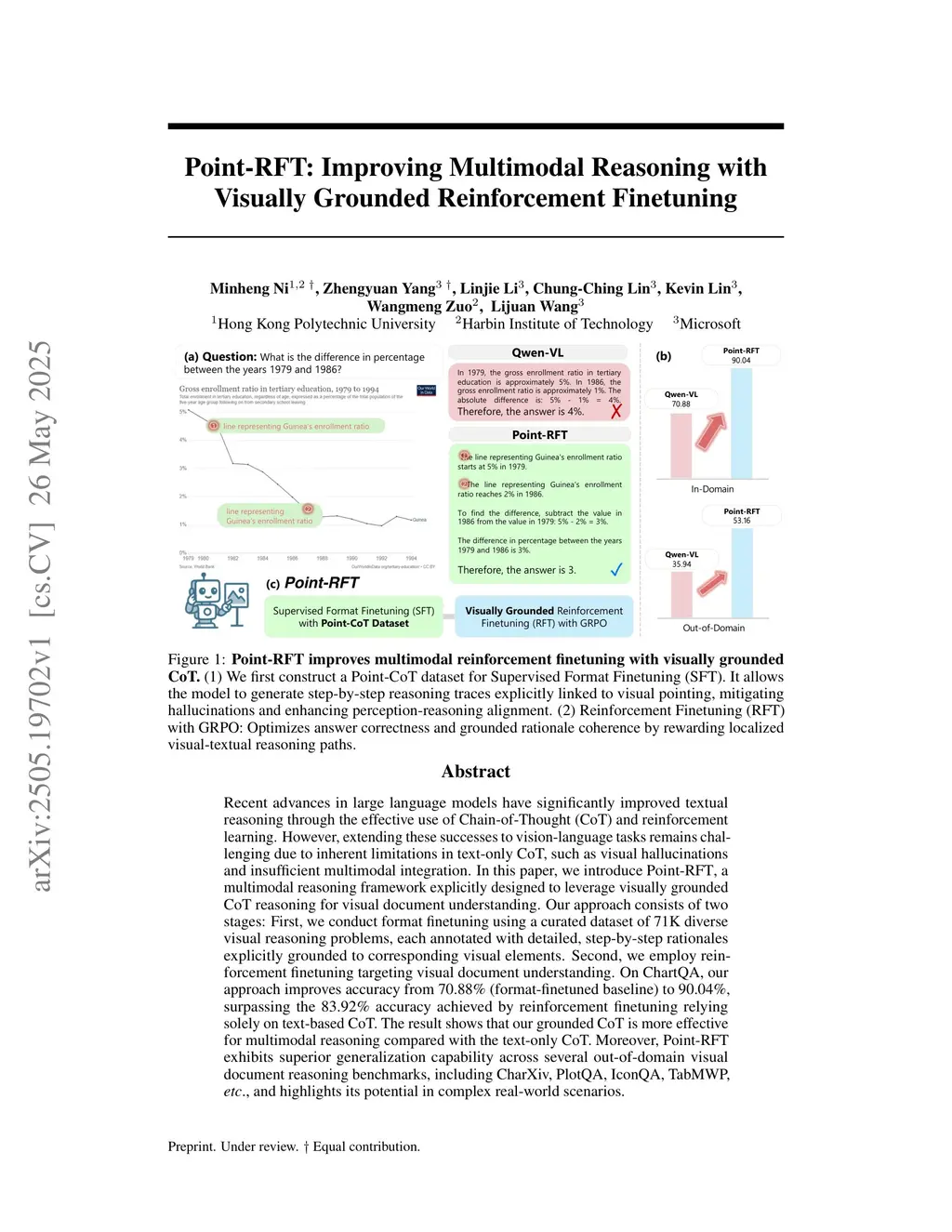 Recent advances in large language models have significantly improved textual reasoning through the effective use of Chain-of-Thought (CoT) and reinforcement learning. However, extending these successes to vision-language tasks remains challenging due to inherent limitations in text-only CoT, such as visual hallucinations and insufficient multimodal integration. In this paper, we introduce Point-RFT, a multimodal reasoning framework explicitly designed to leverage visually grounded CoT reasoning for visual document understanding. Our approach consists of two stages: First, we conduct format finetuning using a curated dataset of 71K diverse visual reasoning problems, each annotated with detailed, step-by-step rationales explicitly grounded to corresponding visual elements. Second, we employ reinforcement finetuning targeting visual document understanding. On ChartQA, our approach improves accuracy from 70.88% (format-finetuned baseline) to 90.04%, surpassing the 83.92% accuracy achieved by reinforcement finetuning relying solely on text-based CoT. The result shows that our grounded CoT is more effective for multimodal reasoning compared with the text-only CoT. Moreover, Point-RFT exhibits superior generalization capability across several out-of-domain visual document reasoning benchmarks, including CharXiv, PlotQA, IconQA, TabMWP, etc., and highlights its potential in complex real-world scenarios.