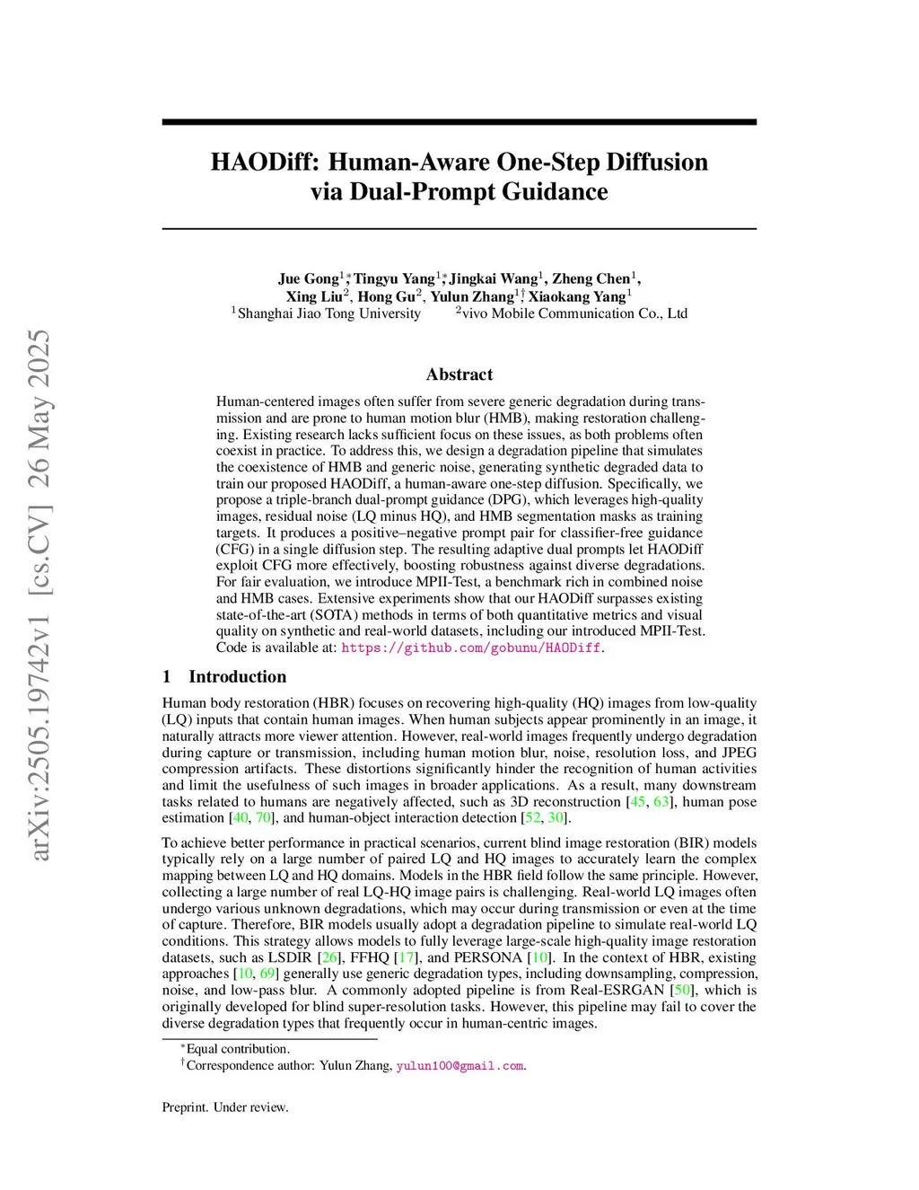 Human-centered images often suffer from severe generic degradation during transmission and are prone to human motion blur (HMB), making restoration challenging. Existing research lacks sufficient focus on these issues, as both problems often coexist in practice. To address this, we design a degradation pipeline that simulates the coexistence of HMB and generic noise, generating synthetic degraded data to train our proposed HAODiff, a human-aware one-step diffusion. Specifically, we propose a triple-branch dual-prompt guidance (DPG), which leverages high-quality images, residual noise (LQ minus HQ), and HMB segmentation masks as training targets. It produces a positive-negative prompt pair for classifier-free guidance (CFG) in a single diffusion step. The resulting adaptive dual prompts let HAODiff exploit CFG more effectively, boosting robustness against diverse degradations. For fair evaluation, we introduce MPII-Test, a benchmark rich in combined noise and HMB cases. Extensive experiments show that our HAODiff surpasses existing state-of-the-art (SOTA) methods in terms of both quantitative metrics and visual quality on synthetic and real-world datasets, including our introduced MPII-Test. Code is available at:this https URL.