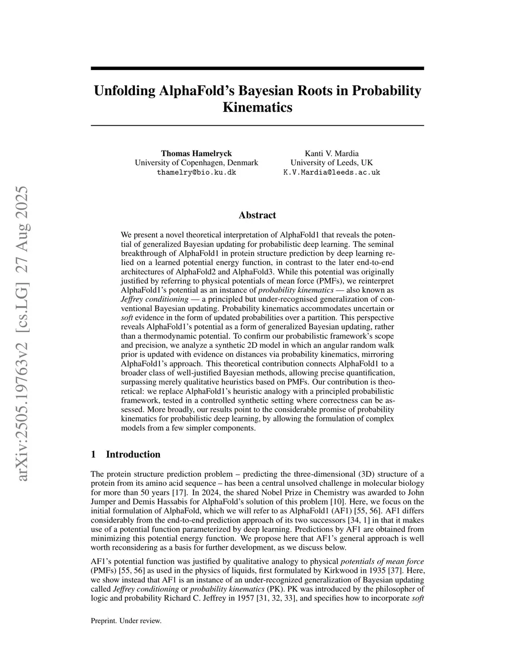 We present a novel theoretical interpretation of AlphaFold1 that reveals the potential of generalized Bayesian updating for probabilistic deep learning. The seminal breakthrough of AlphaFold1 in protein structure prediction by deep learning relied on a learned potential energy function, in contrast to the later end-to-end architectures of AlphaFold2 and AlphaFold3. While this potential was originally justified by referring to physical potentials of mean force (PMFs), we reinterpret AlphaFold1's potential as an instance of {\em probability kinematics} -- also known as {\em Jeffrey conditioning} -- a principled but under-recognised generalization of conventional Bayesian updating. Probability kinematics accommodates uncertain or {\em soft} evidence in the form of updated probabilities over a partition. This perspective reveals AlphaFold1's potential as a form of generalized Bayesian updating, rather than a thermodynamic potential. To confirm our probabilistic framework's scope and precision, we analyze a synthetic 2D model in which an angular random walk prior is updated with evidence on distances via probability kinematics, mirroring AlphaFold1's approach. This theoretical contribution connects AlphaFold1 to a broader class of well-justified Bayesian methods, allowing precise quantification, surpassing merely qualitative heuristics based on PMFs. Our contribution is theoretical: we replace AlphaFold1's heuristic analogy with a principled probabilistic framework, tested in a controlled synthetic setting where correctness can be assessed. More broadly, our results point to the considerable promise of probability kinematics for probabilistic deep learning, by allowing the formulation of complex models from a few simpler components.