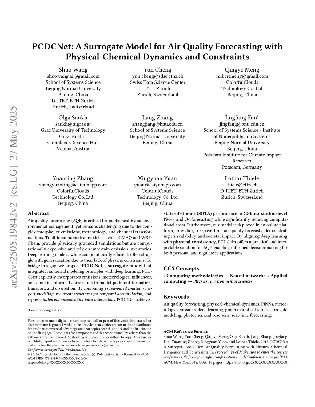 Air quality forecasting (AQF) is critical for public health and environmental management, yet remains challenging due to the complex interplay of emissions, meteorology, and chemical transformations. Traditional numerical models, such as CMAQ and WRF-Chem, provide physically grounded simulations but are computationally expensive and rely on uncertain emission inventories. Deep learning models, while computationally efficient, often struggle with generalization due to their lack of physical constraints. To bridge this gap, we propose PCDCNet, a surrogate model that integrates numerical modeling principles with deep learning. PCDCNet explicitly incorporates emissions, meteorological influences, and domain-informed constraints to model pollutant formation, transport, and dissipation. By combining graph-based spatial transport modeling, recurrent structures for temporal accumulation, and representation enhancement for local interactions, PCDCNet achieves state-of-the-art (SOTA) performance in 72-hour station-level PM2.5 and O3 forecasting while significantly reducing computational costs. Furthermore, our model is deployed in an online platform, providing free, real-time air quality forecasts, demonstrating its scalability and societal impact. By aligning deep learning with physical consistency, PCDCNet offers a practical and interpretable solution for AQF, enabling informed decision-making for both personal and regulatory applications.