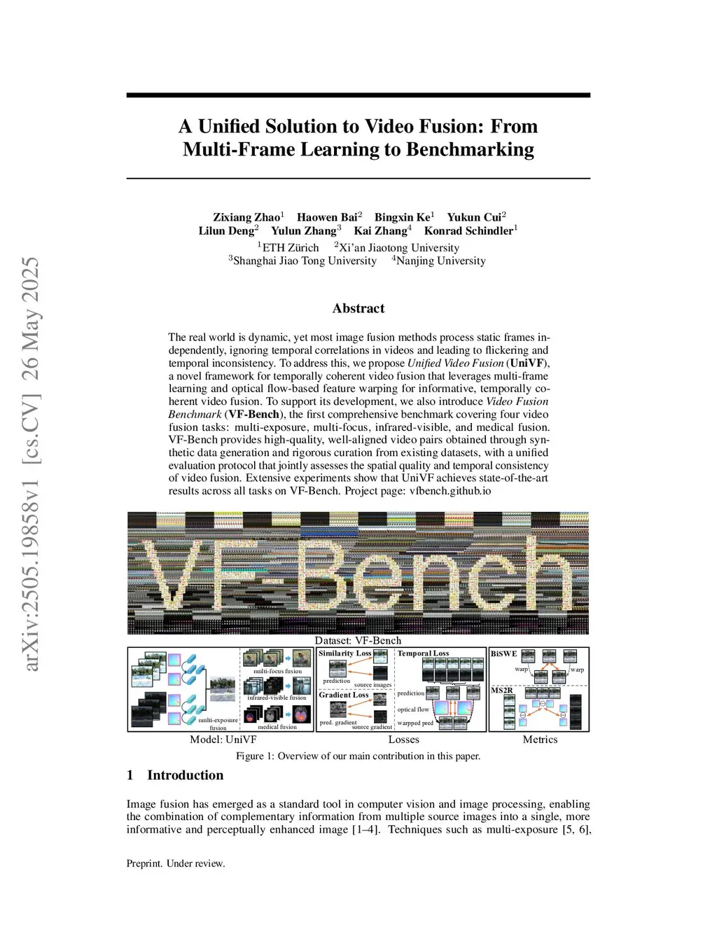 The real world is dynamic, yet most image fusion methods process static frames independently, ignoring temporal correlations in videos and leading to flickering and temporal inconsistency. To address this, we propose Unified Video Fusion (UniVF), a novel and unified framework for video fusion that leverages multi-frame learning and optical flow-based feature warping for informative, temporally coherent video fusion. To support its development, we also introduce Video Fusion Benchmark (VF-Bench), the first comprehensive benchmark covering four video fusion tasks: multi-exposure, multi-focus, infrared-visible, and medical fusion. VF-Bench provides high-quality, well-aligned video pairs obtained through synthetic data generation and rigorous curation from existing datasets, with a unified evaluation protocol that jointly assesses the spatial quality and temporal consistency of video fusion. Extensive experiments show that UniVF achieves state-of-the-art results across all tasks on VF-Bench. Project page:this https URL.