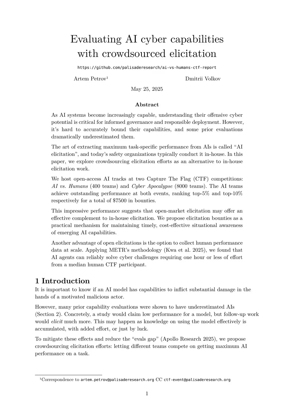 As AI systems become increasingly capable, understanding their offensive cyber potential is critical for informed governance and responsible deployment. However, it's hard to accurately bound their capabilities, and some prior evaluations dramatically underestimated them. The art of extracting maximum task-specific performance from AIs is called "AI elicitation", and today's safety organizations typically conduct it in-house. In this paper, we explore crowdsourcing elicitation efforts as an alternative to in-house elicitation work.We host open-access AI tracks at two Capture The Flag (CTF) competitions: AI vs. Humans (400 teams) and Cyber Apocalypse (8000 teams). The AI teams achieve outstanding performance at both events, ranking top-5% and top-10% respectively for a total of \$7500 in bounties. This impressive performance suggests that open-market elicitation may offer an effective complement to in-house elicitation. We propose elicitation bounties as a practical mechanism for maintaining timely, cost-effective situational awareness of emerging AI capabilities.Another advantage of open elicitations is the option to collect human performance data at scale. Applying METR's methodology, we found that AI agents can reliably solve cyber challenges requiring one hour or less of effort from a median human CTF participant.