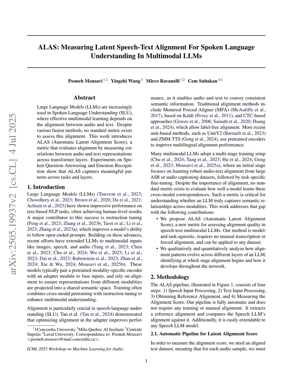 Large Language Models (LLMs) are increasingly used in Spoken Language Understanding (SLU), where effective multimodal learning depends on the alignment between audio and text. Despite various fusion methods, no standard metric exists to assess this alignment. This work introduces ALAS (Automatic Latent Alignment Score), a metric that evaluates alignment by measuring correlations between audio and text representations across transformer layers. Experiments on Spoken Question Answering and Emotion Recognition show that ALAS captures meaningful patterns across tasks and layers.