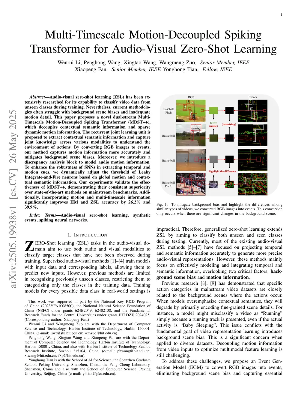 Audio-visual zero-shot learning (ZSL) has been extensively researched for its capability to classify video data from unseen classes during training. Nevertheless, current methodologies often struggle with background scene biases and inadequate motion detail. This paper proposes a novel dual-stream Multi-Timescale Motion-Decoupled Spiking Transformer (MDST++), which decouples contextual semantic information and sparse dynamic motion information. The recurrent joint learning unit is proposed to extract contextual semantic information and capture joint knowledge across various modalities to understand the environment of actions. By converting RGB images to events, our method captures motion information more accurately and mitigates background scene biases. Moreover, we introduce a discrepancy analysis block to model audio motion information. To enhance the robustness of SNNs in extracting temporal and motion cues, we dynamically adjust the threshold of Leaky Integrate-and-Fire neurons based on global motion and contextual semantic information. Our experiments validate the effectiveness of MDST++, demonstrating their consistent superiority over state-of-the-art methods on mainstream benchmarks. Additionally, incorporating motion and multi-timescale information significantly improves HM and ZSL accuracy by 26.2\% and 39.9\%.