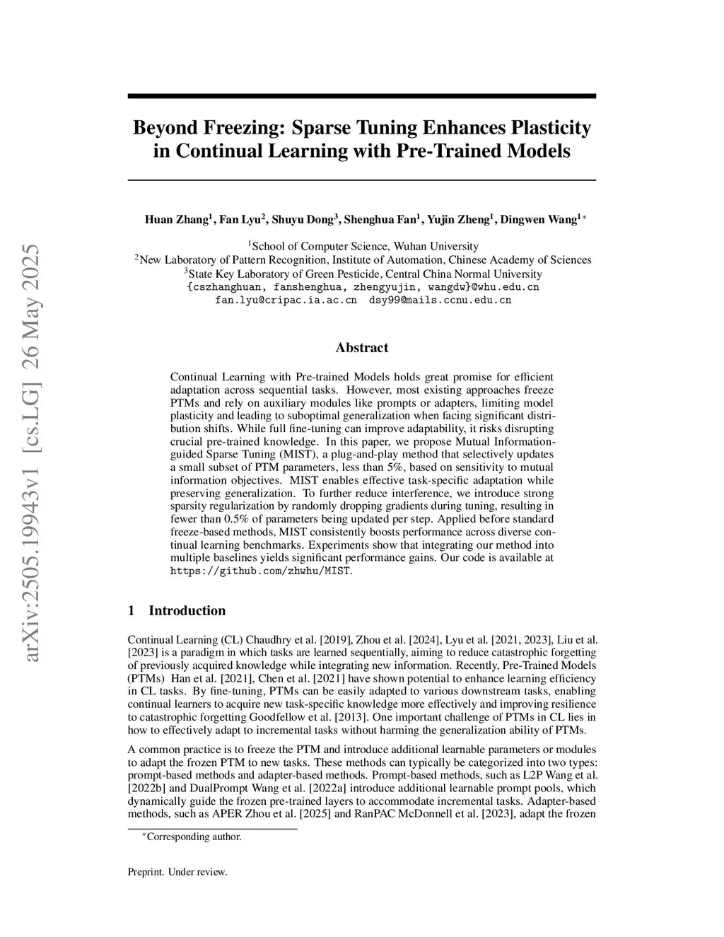 Continual Learning with Pre-trained Models holds great promise for efficient adaptation across sequential tasks. However, most existing approaches freeze PTMs and rely on auxiliary modules like prompts or adapters, limiting model plasticity and leading to suboptimal generalization when facing significant distribution shifts. While full fine-tuning can improve adaptability, it risks disrupting crucial pre-trained knowledge. In this paper, we propose Mutual Information-guided Sparse Tuning (MIST), a plug-and-play method that selectively updates a small subset of PTM parameters, less than 5%, based on sensitivity to mutual information objectives. MIST enables effective task-specific adaptation while preserving generalization. To further reduce interference, we introduce strong sparsity regularization by randomly dropping gradients during tuning, resulting in fewer than 0.5% of parameters being updated per step. Applied before standard freeze-based methods, MIST consistently boosts performance across diverse continual learning benchmarks. Experiments show that integrating our method into multiple baselines yields significant performance gains. Our code is available atthis https URL.