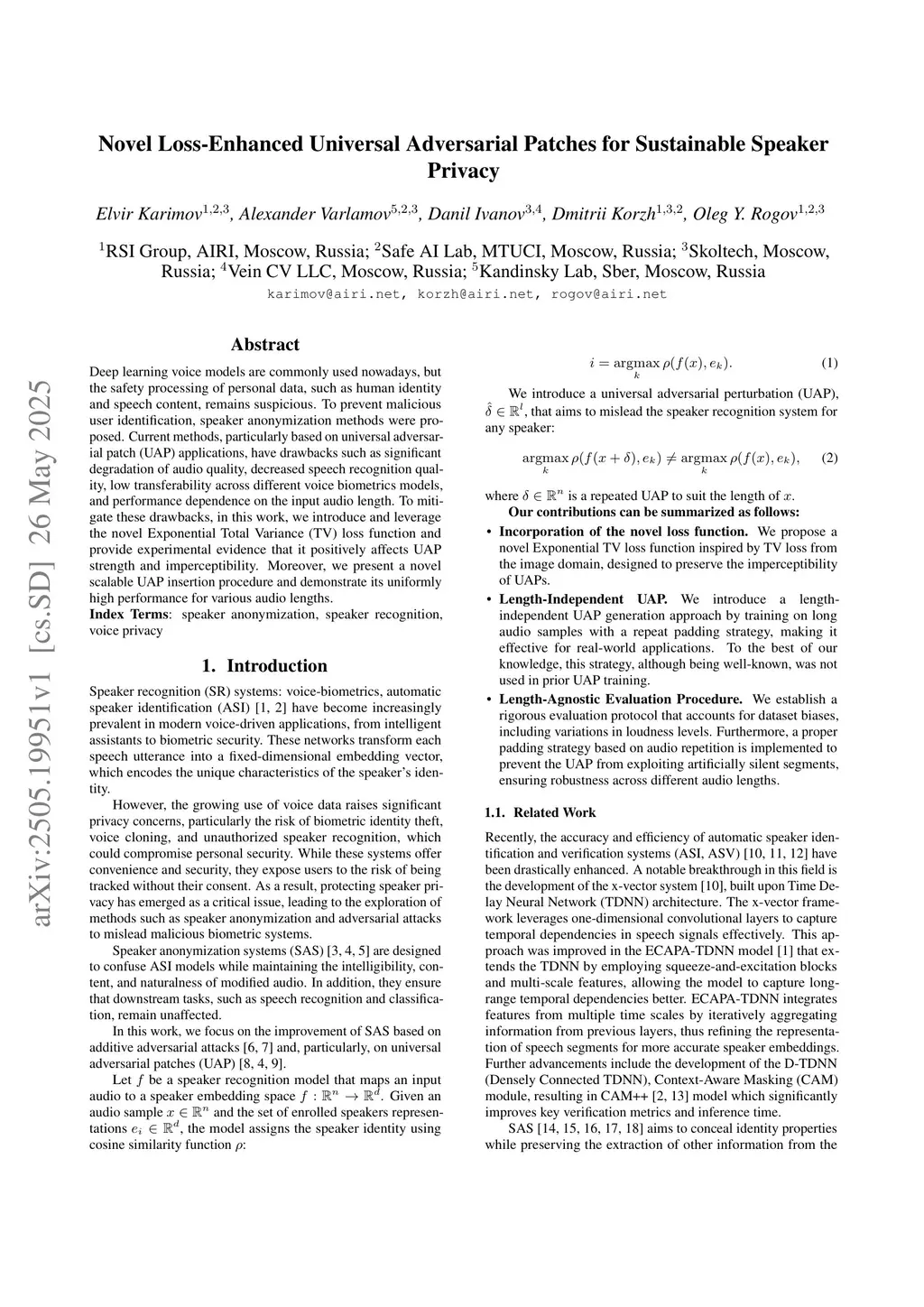 Deep learning voice models are commonly used nowadays, but the safety processing of personal data, such as human identity and speech content, remains suspicious. To prevent malicious user identification, speaker anonymization methods were proposed. Current methods, particularly based on universal adversarial patch (UAP) applications, have drawbacks such as significant degradation of audio quality, decreased speech recognition quality, low transferability across different voice biometrics models, and performance dependence on the input audio length. To mitigate these drawbacks, in this work, we introduce and leverage the novel Exponential Total Variance (TV) loss function and provide experimental evidence that it positively affects UAP strength and imperceptibility. Moreover, we present a novel scalable UAP insertion procedure and demonstrate its uniformly high performance for various audio lengths.