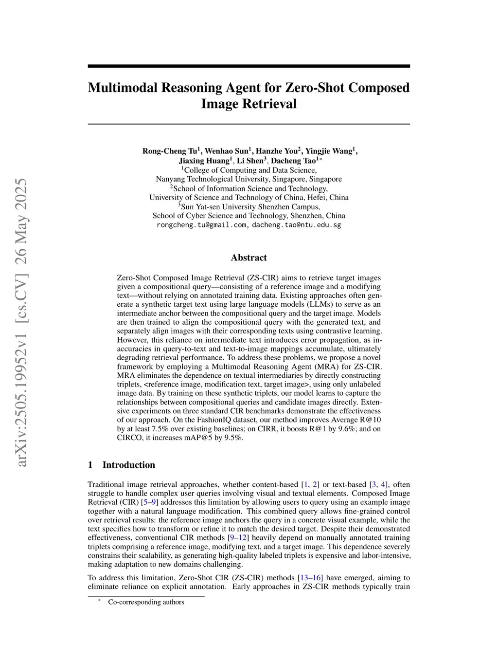 Zero-Shot Composed Image Retrieval (ZS-CIR) aims to retrieve target images given a compositional query, consisting of a reference image and a modifying text-without relying on annotated training data. Existing approaches often generate a synthetic target text using large language models (LLMs) to serve as an intermediate anchor between the compositional query and the target image. Models are then trained to align the compositional query with the generated text, and separately align images with their corresponding texts using contrastive learning. However, this reliance on intermediate text introduces error propagation, as inaccuracies in query-to-text and text-to-image mappings accumulate, ultimately degrading retrieval performance. To address these problems, we propose a novel framework by employing a Multimodal Reasoning Agent (MRA) for ZS-CIR. MRA eliminates the dependence on textual intermediaries by directly constructing triplets, <reference image, modification text, target image>, using only unlabeled image data. By training on these synthetic triplets, our model learns to capture the relationships between compositional queries and candidate images directly. Extensive experiments on three standard CIR benchmarks demonstrate the effectiveness of our approach. On the FashionIQ dataset, our method improves Average R@10 by at least 7.5\% over existing baselines; on CIRR, it boosts R@1 by 9.6\%; and on CIRCO, it increases mAP@5 by 9.5\%.