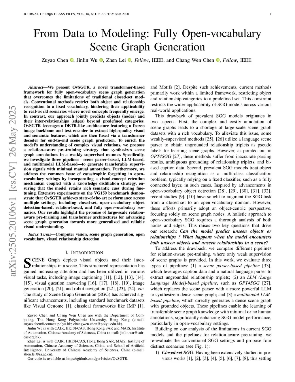 We present OvSGTR, a novel transformer-based framework for fully open-vocabulary scene graph generation that overcomes the limitations of traditional closed-set models. Conventional methods restrict both object and relationship recognition to a fixed vocabulary, hindering their applicability to real-world scenarios where novel concepts frequently emerge. In contrast, our approach jointly predicts objects (nodes) and their inter-relationships (edges) beyond predefined categories. OvSGTR leverages a DETR-like architecture featuring a frozen image backbone and text encoder to extract high-quality visual and semantic features, which are then fused via a transformer decoder for end-to-end scene graph prediction. To enrich the model's understanding of complex visual relations, we propose a relation-aware pre-training strategy that synthesizes scene graph annotations in a weakly supervised manner. Specifically, we investigate three pipelines--scene parser-based, LLM-based, and multimodal LLM-based--to generate transferable supervision signals with minimal manual annotation. Furthermore, we address the common issue of catastrophic forgetting in open-vocabulary settings by incorporating a visual-concept retention mechanism coupled with a knowledge distillation strategy, ensuring that the model retains rich semantic cues during fine-tuning. Extensive experiments on the VG150 benchmark demonstrate that OvSGTR achieves state-of-the-art performance across multiple settings, including closed-set, open-vocabulary object detection-based, relation-based, and fully open-vocabulary scenarios. Our results highlight the promise of large-scale relation-aware pre-training and transformer architectures for advancing scene graph generation towards more generalized and reliable visual understanding.