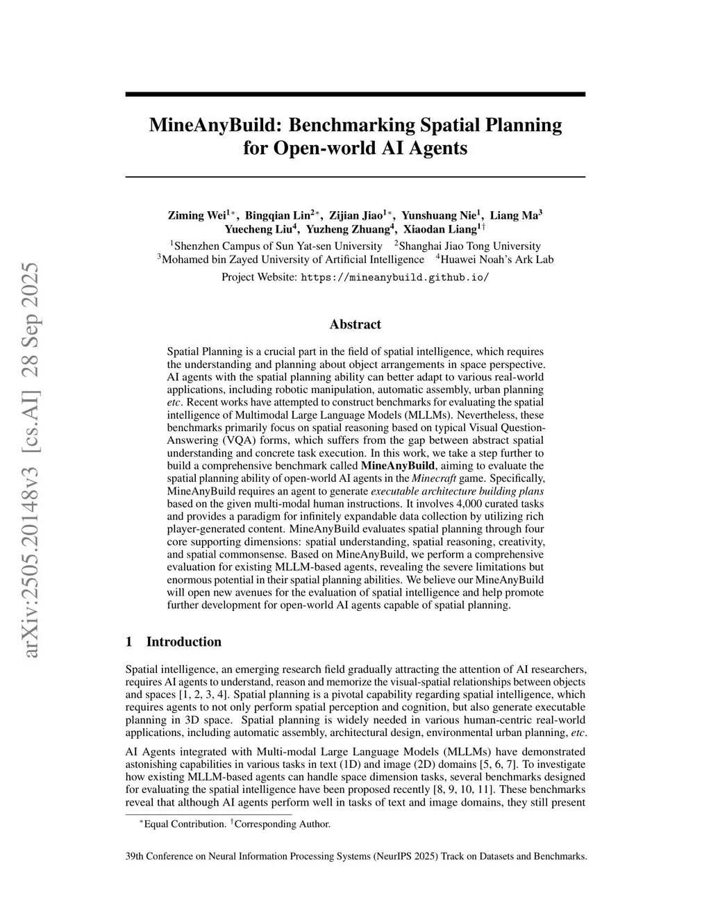Spatial Planning is a crucial part in the field of spatial intelligence, which requires the understanding and planning about object arrangements in space perspective. AI agents with the spatial planning ability can better adapt to various real-world applications, including robotic manipulation, automatic assembly, urban planning etc. Recent works have attempted to construct benchmarks for evaluating the spatial intelligence of Multimodal Large Language Models (MLLMs). Nevertheless, these benchmarks primarily focus on spatial reasoning based on typical Visual Question-Answering (VQA) forms, which suffers from the gap between abstract spatial understanding and concrete task execution. In this work, we take a step further to build a comprehensive benchmark called MineAnyBuild, aiming to evaluate the spatial planning ability of open-world AI agents in the Minecraft game. Specifically, MineAnyBuild requires an agent to generate executable architecture building plans based on the given multi-modal human instructions. It involves 4,000 curated spatial planning tasks and also provides a paradigm for infinitely expandable data collection by utilizing rich player-generated content. MineAnyBuild evaluates spatial planning through four core supporting dimensions: spatial understanding, spatial reasoning, creativity, and spatial commonsense. Based on MineAnyBuild, we perform a comprehensive evaluation for existing MLLM-based agents, revealing the severe limitations but enormous potential in their spatial planning abilities. We believe our MineAnyBuild will open new avenues for the evaluation of spatial intelligence and help promote further development for open-world AI agents capable of spatial planning.