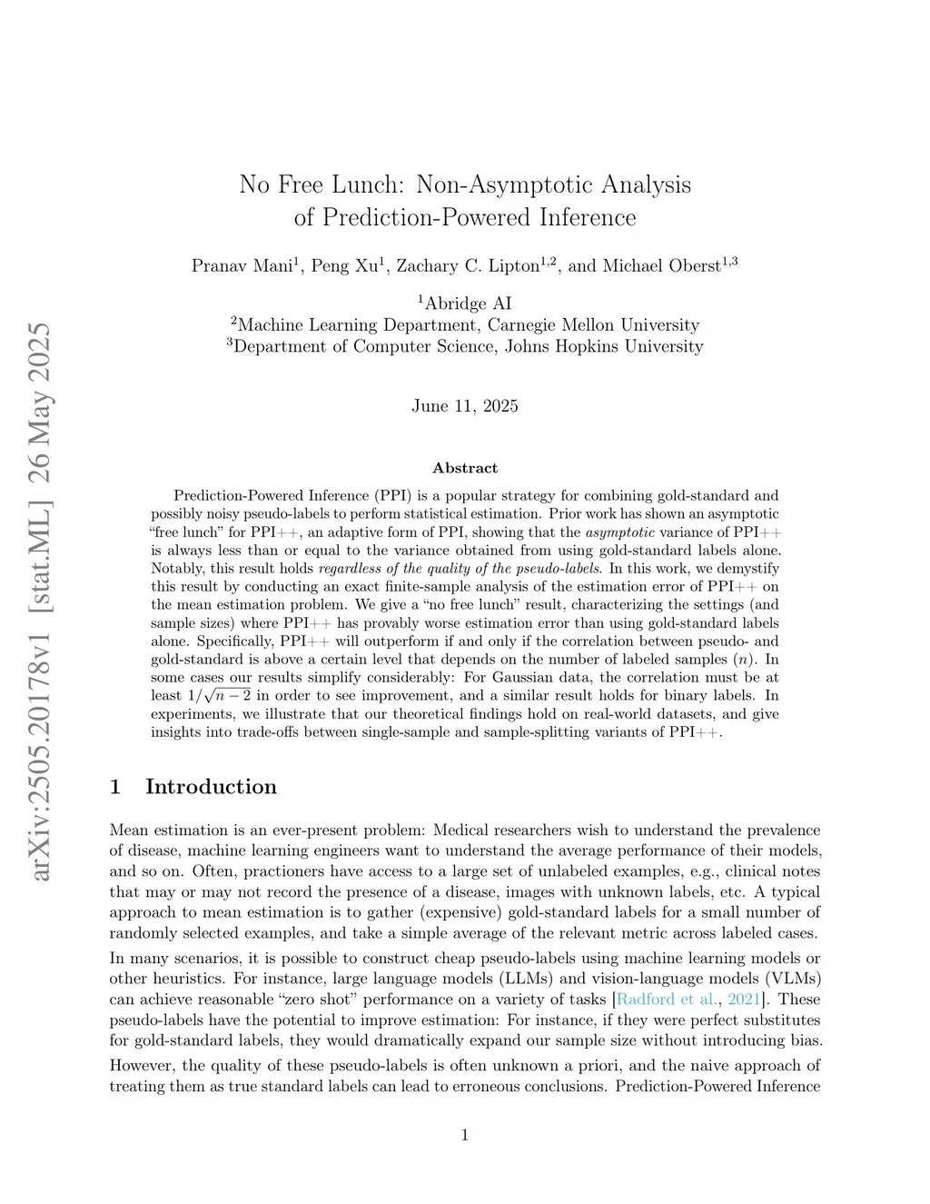 Prediction-Powered Inference (PPI) is a popular strategy for combining gold-standard and possibly noisy pseudo-labels to perform statistical estimation. Prior work has shown an asymptotic "free lunch" for PPI++, an adaptive form of PPI, showing that the *asymptotic* variance of PPI++ is always less than or equal to the variance obtained from using gold-standard labels alone. Notably, this result holds *regardless of the quality of the pseudo-labels*. In this work, we demystify this result by conducting an exact finite-sample analysis of the estimation error of PPI++ on the mean estimation problem. We give a "no free lunch" result, characterizing the settings (and sample sizes) where PPI++ has provably worse estimation error than using gold-standard labels alone. Specifically, PPI++ will outperform if and only if the correlation between pseudo- and gold-standard is above a certain level that depends on the number of labeled samples (). In some cases our results simplify considerably: For Gaussian data, the correlation must be at least in order to see improvement, and a similar result holds for binary labels. In experiments, we illustrate that our theoretical findings hold on real-world datasets, and give insights into trade-offs between single-sample and sample-splitting variants of PPI++.