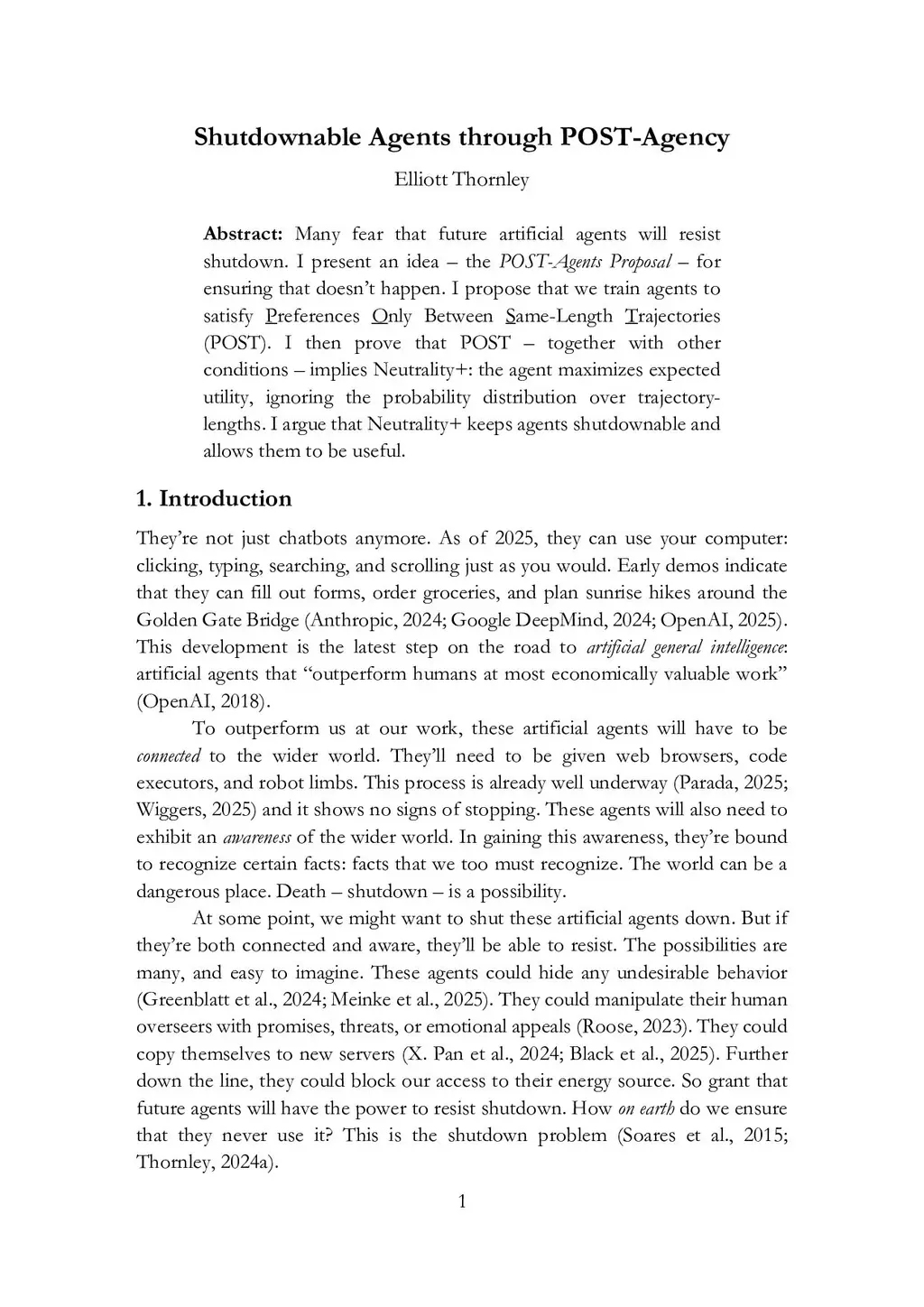 Many fear that future artificial agents will resist shutdown. I present an idea - the POST-Agents Proposal - for ensuring that doesn't happen. I propose that we train agents to satisfy Preferences Only Between Same-Length Trajectories (POST). I then prove that POST - together with other conditions - implies Neutrality+: the agent maximizes expected utility, ignoring the probability distribution over trajectory-lengths. I argue that Neutrality+ keeps agents shutdownable and allows them to be useful.