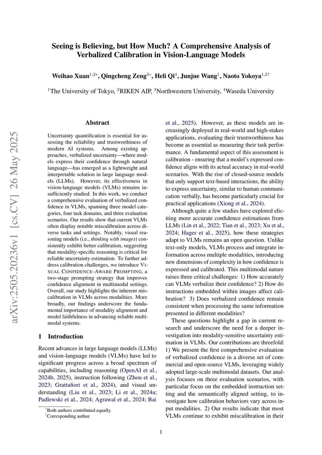 Uncertainty quantification is essential for assessing the reliability and trustworthiness of modern AI systems. Among existing approaches, verbalized uncertainty, where models express their confidence through natural language, has emerged as a lightweight and interpretable solution in large language models (LLMs). However, its effectiveness in vision-language models (VLMs) remains insufficiently studied. In this work, we conduct a comprehensive evaluation of verbalized confidence in VLMs, spanning three model categories, four task domains, and three evaluation scenarios. Our results show that current VLMs often display notable miscalibration across diverse tasks and settings. Notably, visual reasoning models (i.e., thinking with images) consistently exhibit better calibration, suggesting that modality-specific reasoning is critical for reliable uncertainty estimation. To further address calibration challenges, we introduce Visual Confidence-Aware Prompting, a two-stage prompting strategy that improves confidence alignment in multimodal settings. Overall, our study highlights the inherent miscalibration in VLMs across modalities. More broadly, our findings underscore the fundamental importance of modality alignment and model faithfulness in advancing reliable multimodal systems.