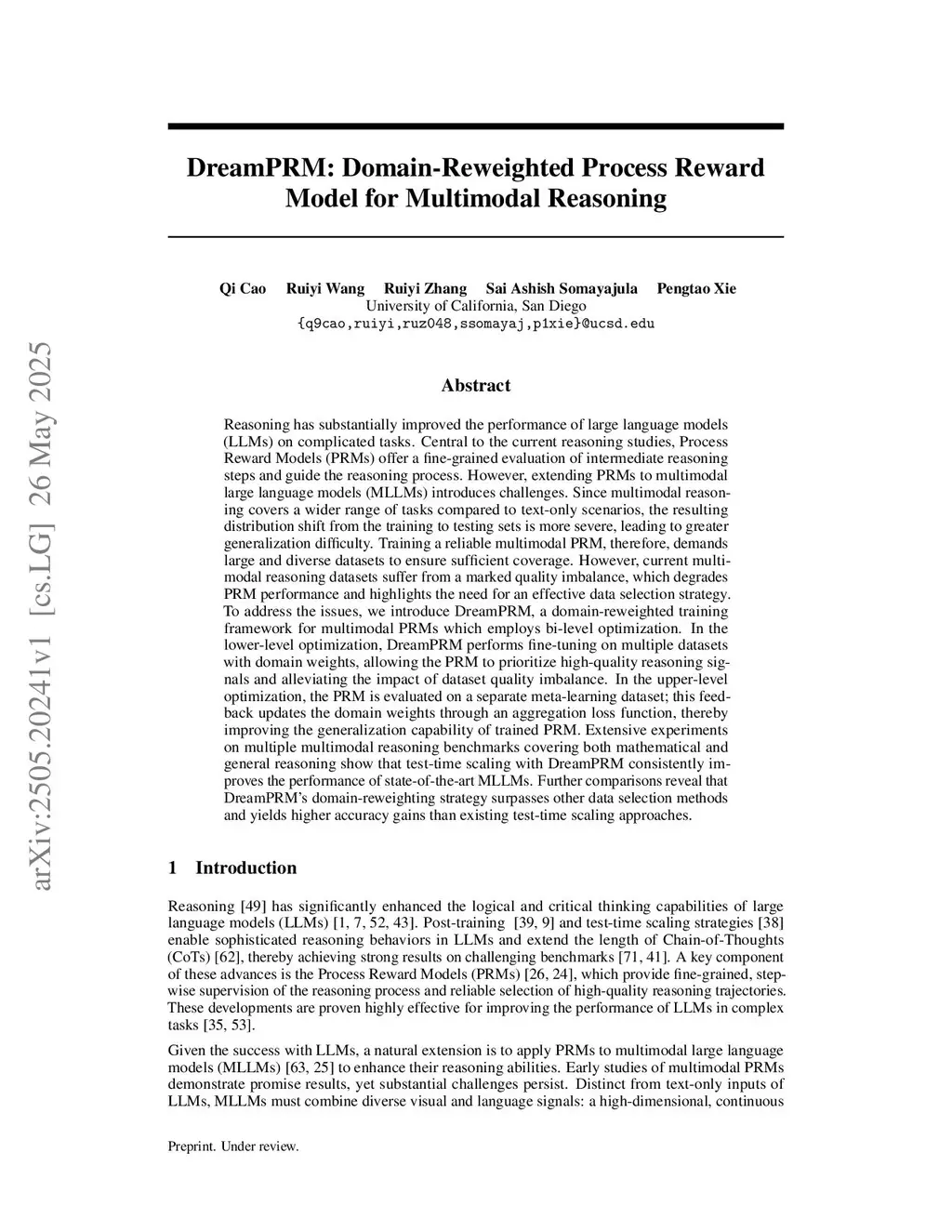Reasoning has substantially improved the performance of large language models (LLMs) on complicated tasks. Central to the current reasoning studies, Process Reward Models (PRMs) offer a fine-grained evaluation of intermediate reasoning steps and guide the reasoning process. However, extending PRMs to multimodal large language models (MLLMs) introduces challenges. Since multimodal reasoning covers a wider range of tasks compared to text-only scenarios, the resulting distribution shift from the training to testing sets is more severe, leading to greater generalization difficulty. Training a reliable multimodal PRM, therefore, demands large and diverse datasets to ensure sufficient coverage. However, current multimodal reasoning datasets suffer from a marked quality imbalance, which degrades PRM performance and highlights the need for an effective data selection strategy. To address the issues, we introduce DreamPRM, a domain-reweighted training framework for multimodal PRMs which employs bi-level optimization. In the lower-level optimization, DreamPRM performs fine-tuning on multiple datasets with domain weights, allowing the PRM to prioritize high-quality reasoning signals and alleviating the impact of dataset quality imbalance. In the upper-level optimization, the PRM is evaluated on a separate meta-learning dataset; this feedback updates the domain weights through an aggregation loss function, thereby improving the generalization capability of trained PRM. Extensive experiments on multiple multimodal reasoning benchmarks covering both mathematical and general reasoning show that test-time scaling with DreamPRM consistently improves the performance of state-of-the-art MLLMs. Further comparisons reveal that DreamPRM's domain-reweighting strategy surpasses other data selection methods and yields higher accuracy gains than existing test-time scaling approaches.