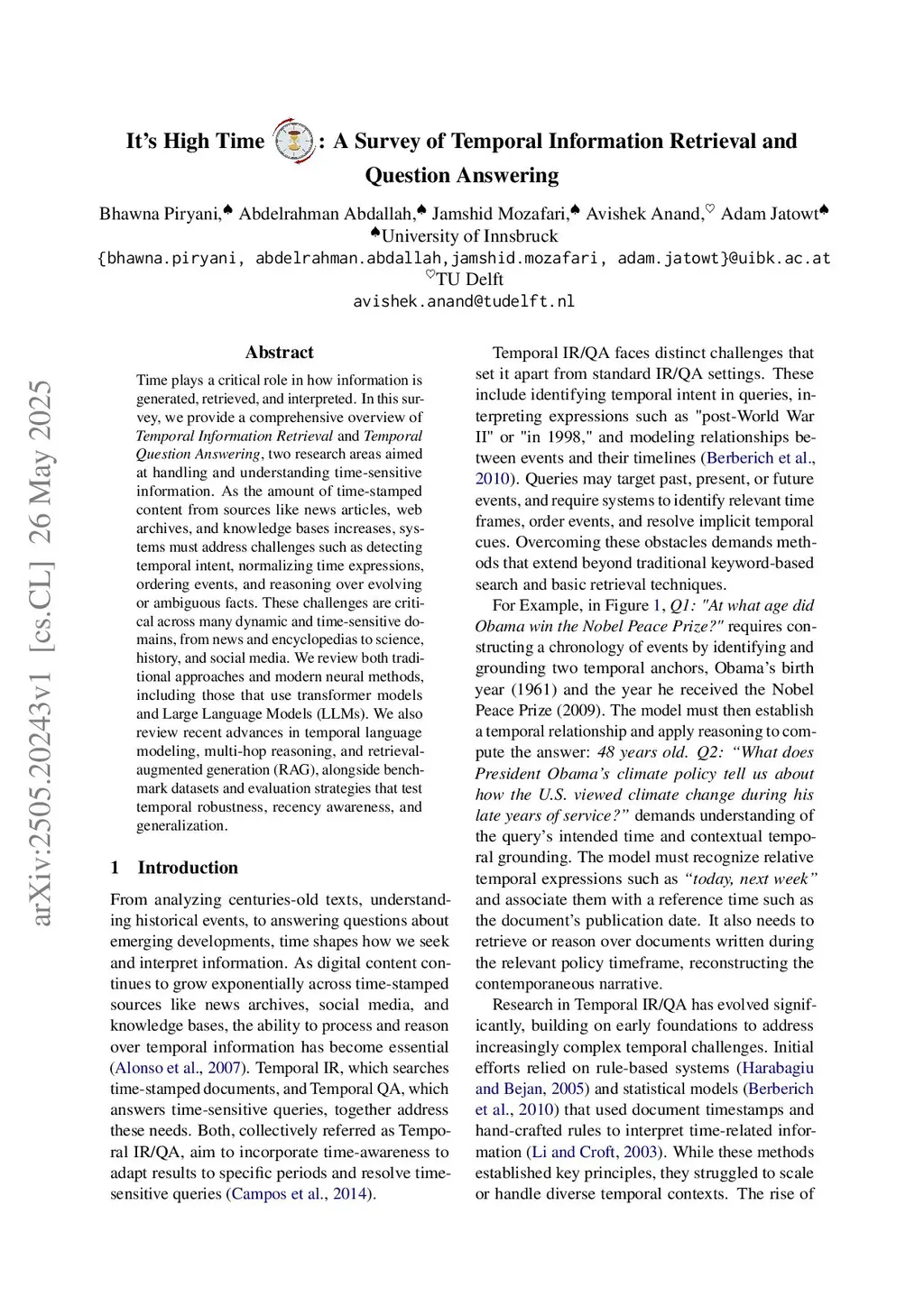 Time plays a critical role in how information is generated, retrieved, and interpreted. In this survey, we provide a comprehensive overview of Temporal Question Answering (TQA), a research area that focuses on answering questions involving temporal constraints or context. As the amount of time-stamped content from sources like news articles, web archives, and knowledge bases increases, systems must address challenges such as detecting temporal intent, normalizing time expressions, ordering events, and reasoning over evolving or ambiguous facts. We focus on recent advances in TQA enabled by neural architectures, especially transformer-based models and Large Language Models (LLMs), highlighting progress in temporal language modeling, retrieval-augmented generation (RAG), and temporal reasoning. We also discuss benchmark datasets and evaluation strategies designed to test temporal robustness, recency awareness, and generalization.