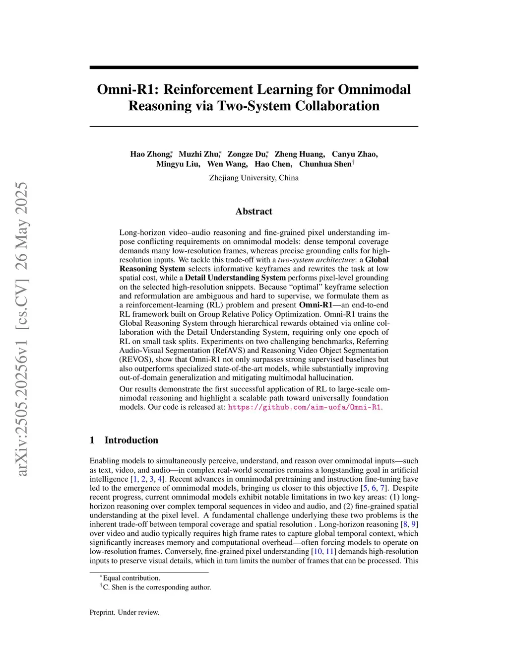 Long-horizon video-audio reasoning and fine-grained pixel understanding impose conflicting requirements on omnimodal models: dense temporal coverage demands many low-resolution frames, whereas precise grounding calls for high-resolution inputs. We tackle this trade-off with a two-system architecture: a Global Reasoning System selects informative keyframes and rewrites the task at low spatial cost, while a Detail Understanding System performs pixel-level grounding on the selected high-resolution snippets. Because ``optimal'' keyframe selection and reformulation are ambiguous and hard to supervise, we formulate them as a reinforcement learning (RL) problem and present Omni-R1, an end-to-end RL framework built on Group Relative Policy Optimization. Omni-R1 trains the Global Reasoning System through hierarchical rewards obtained via online collaboration with the Detail Understanding System, requiring only one epoch of RL on small task splits.Experiments on two challenging benchmarks, namely Referring Audio-Visual Segmentation (RefAVS) and Reasoning Video Object Segmentation (REVOS), show that Omni-R1 not only surpasses strong supervised baselines but also outperforms specialized state-of-the-art models, while substantially improving out-of-domain generalization and mitigating multimodal hallucination. Our results demonstrate the first successful application of RL to large-scale omnimodal reasoning and highlight a scalable path toward universally foundation models.