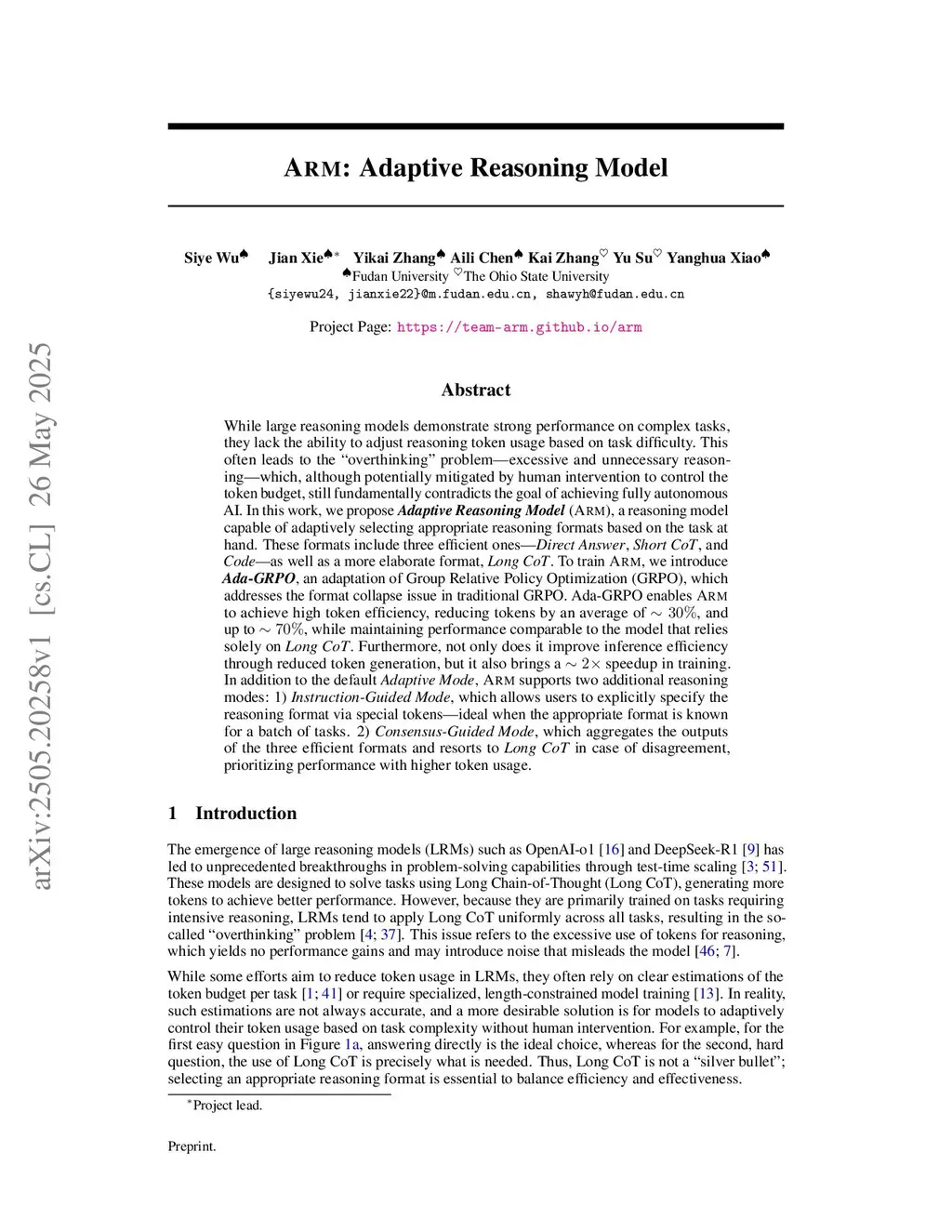 While large reasoning models demonstrate strong performance on complex tasks, they lack the ability to adjust reasoning token usage based on task difficulty. This often leads to the "overthinking" problem -- excessive and unnecessary reasoning -- which, although potentially mitigated by human intervention to control the token budget, still fundamentally contradicts the goal of achieving fully autonomous AI. In this work, we propose Adaptive Reasoning Model (ARM), a reasoning model capable of adaptively selecting appropriate reasoning formats based on the task at hand. These formats include three efficient ones -- Direct Answer, Short CoT, and Code -- as well as a more elaborate format, Long CoT. To train ARM, we introduce Ada-GRPO, an adaptation of Group Relative Policy Optimization (GRPO), which addresses the format collapse issue in traditional GRPO. Ada-GRPO enables ARM to achieve high token efficiency, reducing tokens by an average of 30%, and up to 70%, while maintaining performance comparable to the model that relies solely on Long CoT. Furthermore, not only does it improve inference efficiency through reduced token generation, but it also brings a 2x speedup in training. In addition to the default Adaptive Mode, ARM supports two additional reasoning modes: 1) Instruction-Guided Mode, which allows users to explicitly specify the reasoning format via special tokens -- ideal when the appropriate format is known for a batch of tasks. 2) Consensus-Guided Mode, which aggregates the outputs of the three efficient formats and resorts to Long CoT in case of disagreement, prioritizing performance with higher token usage.