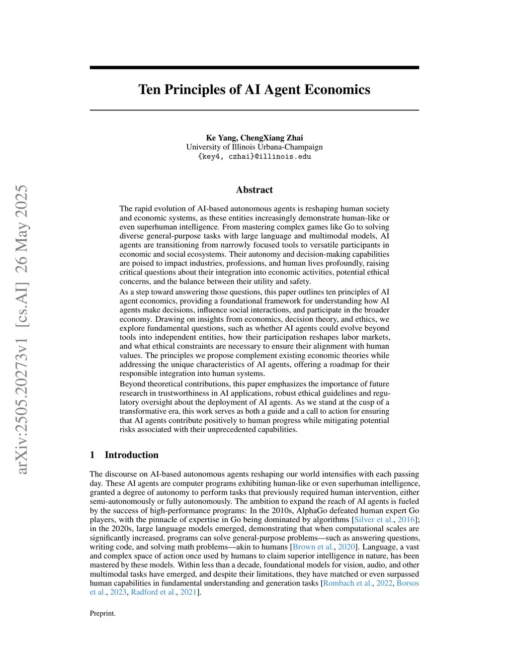 The rapid rise of AI-based autonomous agents is transforming human society and economic systems, as these entities increasingly exhibit human-like or superhuman intelligence. From excelling at complex games like Go to tackling diverse general-purpose tasks with large language and multimodal models, AI agents are evolving from specialized tools into dynamic participants in social and economic ecosystems. Their autonomy and decision-making capabilities are poised to impact industries, professions, and human lives profoundly, raising critical questions about their integration into economic activities, potential ethical concerns, and the balance between their utility and safety.To address these challenges, this paper presents ten principles of AI agent economics, offering a framework to understand how AI agents make decisions, influence social interactions, and participate in the broader economy. Drawing on economics, decision theory, and ethics, we explore fundamental questions, such as whether AI agents might evolve from tools into independent entities, their impact on labor markets, and the ethical safeguards needed to align them with human values. These principles build on existing economic theories while accounting for the unique traits of AI agents, providing a roadmap for their responsible integration into human systems.Beyond theoretical insights, this paper highlights the urgency of future research into AI trustworthiness, ethical guidelines, and regulatory oversight. As we enter a transformative era, this work serves as both a guide and a call to action, ensuring AI agents contribute positively to human progress while addressing risks tied to their unprecedented capabilities.
