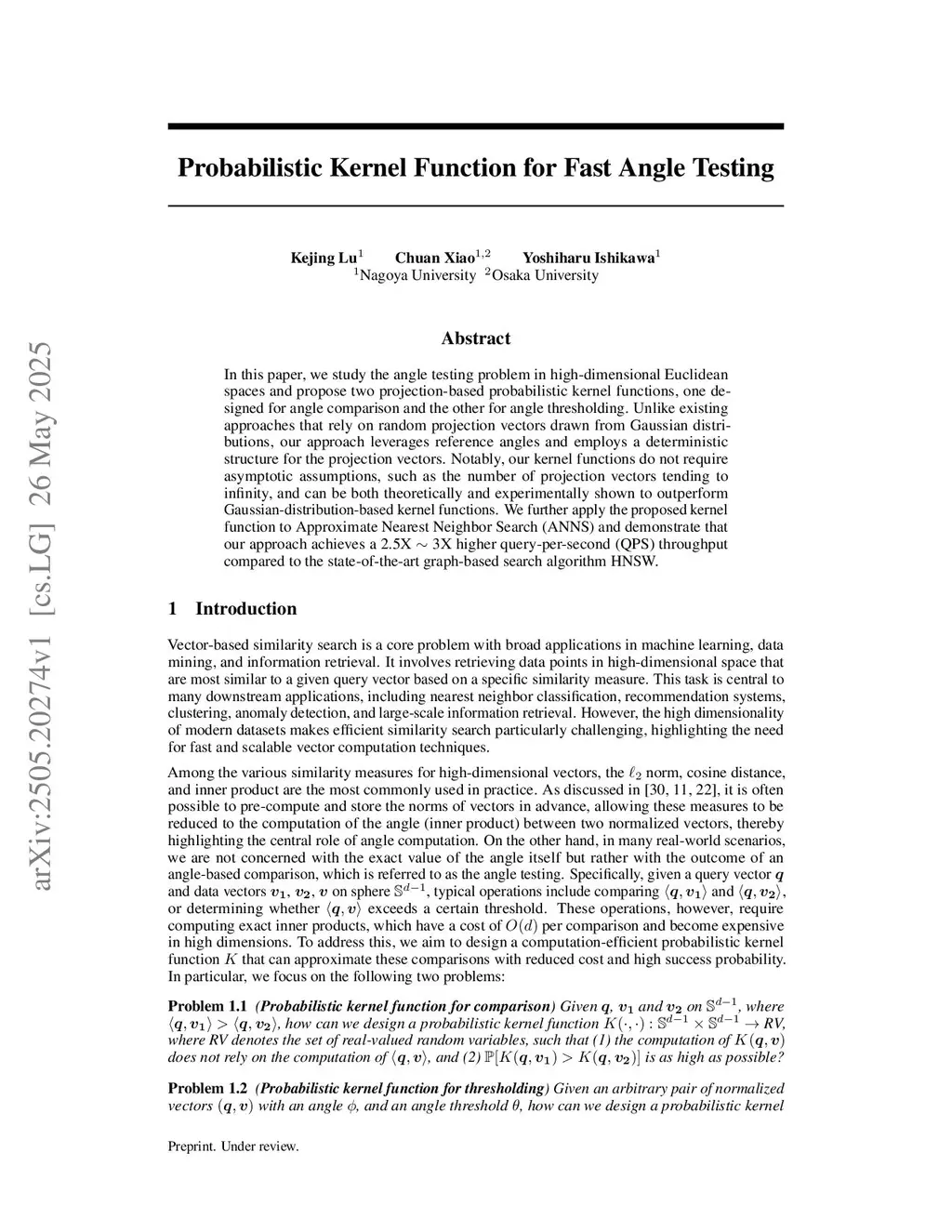 In this paper, we study the angle testing problem in the context of similarity search in high-dimensional Euclidean spaces and propose two projection-based probabilistic kernel functions, one designed for angle comparison and the other for angle thresholding. Unlike existing approaches that rely on random projection vectors drawn from Gaussian distributions, our approach leverages reference angles and adopts a deterministic structure for the projection vectors. Notably, our kernel functions do not require asymptotic assumptions, such as the number of projection vectors tending to infinity, and can be theoretically and experimentally shown to outperform Gaussian-distribution-based kernel functions. We apply the proposed kernel function to Approximate Nearest Neighbor Search (ANNS) and demonstrate that our approach achieves a 2.5x--3x higher query-per-second (QPS) throughput compared to the widely-used graph-based search algorithm HNSW.