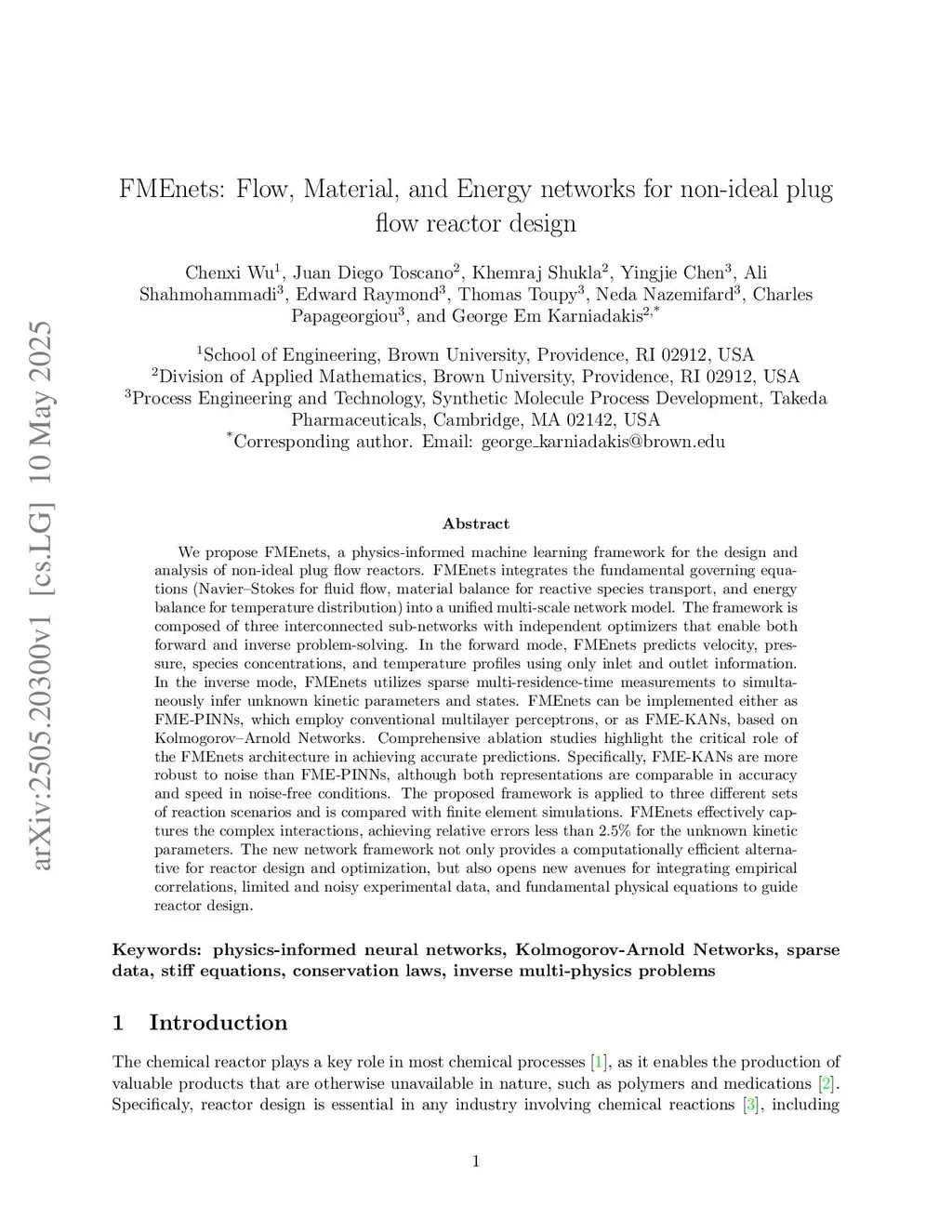 We propose FMEnets, a physics-informed machine learning framework for the design and analysis of non-ideal plug flow reactors. FMEnets integrates the fundamental governing equations (Navier-Stokes for fluid flow, material balance for reactive species transport, and energy balance for temperature distribution) into a unified multi-scale network model. The framework is composed of three interconnected sub-networks with independent optimizers that enable both forward and inverse problem-solving. In the forward mode, FMEnets predicts velocity, pressure, species concentrations, and temperature profiles using only inlet and outlet information. In the inverse mode, FMEnets utilizes sparse multi-residence-time measurements to simultaneously infer unknown kinetic parameters and states. FMEnets can be implemented either as FME-PINNs, which employ conventional multilayer perceptrons, or as FME-KANs, based on Kolmogorov-Arnold Networks. Comprehensive ablation studies highlight the critical role of the FMEnets architecture in achieving accurate predictions. Specifically, FME-KANs are more robust to noise than FME-PINNs, although both representations are comparable in accuracy and speed in noise-free conditions. The proposed framework is applied to three different sets of reaction scenarios and is compared with finite element simulations. FMEnets effectively captures the complex interactions, achieving relative errors less than 2.5% for the unknown kinetic parameters. The new network framework not only provides a computationally efficient alternative for reactor design and optimization, but also opens new avenues for integrating empirical correlations, limited and noisy experimental data, and fundamental physical equations to guide reactor design.