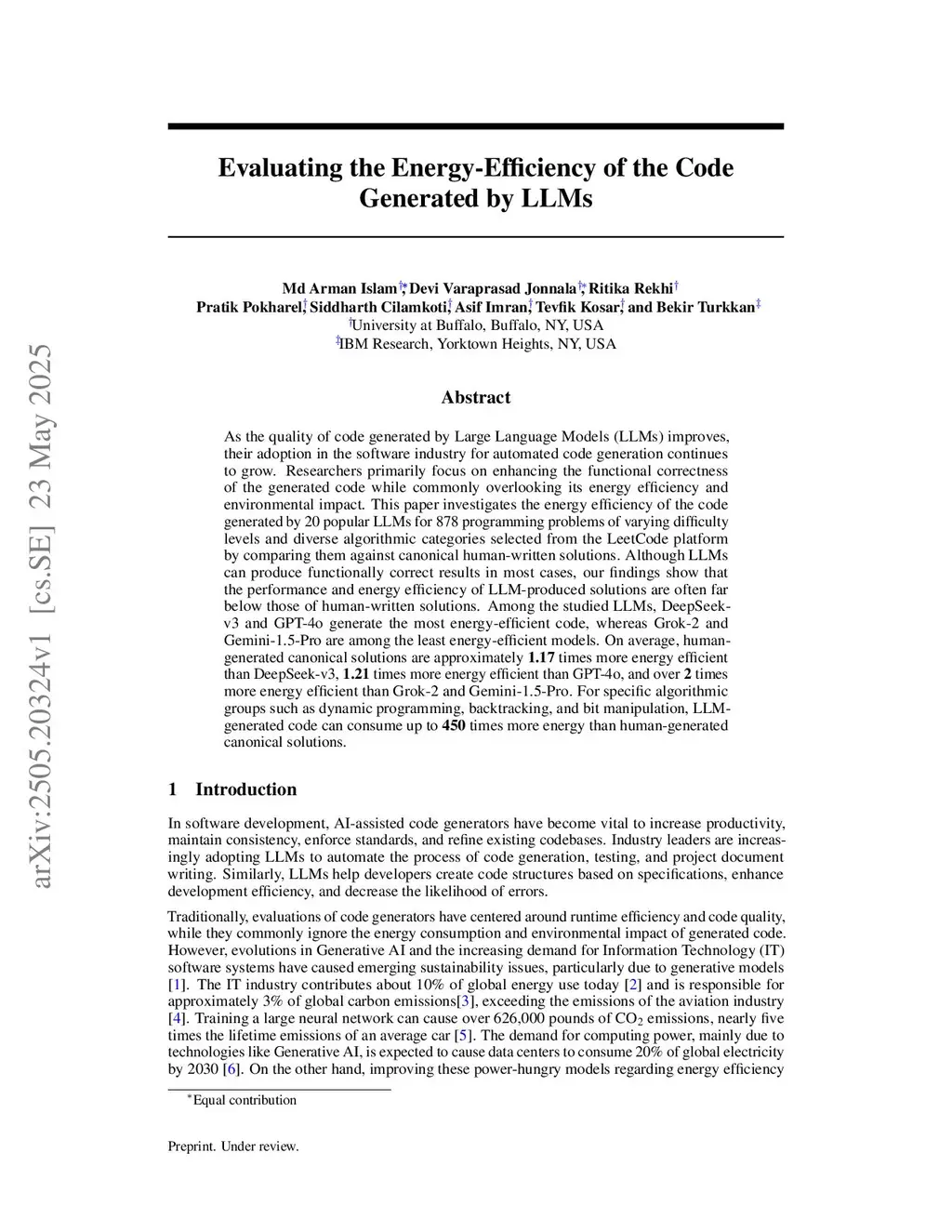As the quality of code generated by Large Language Models (LLMs) improves, their adoption in the software industry for automated code generation continues to grow. Researchers primarily focus on enhancing the functional correctness of the generated code while commonly overlooking its energy efficiency and environmental impact. This paper investigates the energy efficiency of the code generated by 20 popular LLMs for 878 programming problems of varying difficulty levels and diverse algorithmic categories selected from the LeetCode platform by comparing them against canonical human-written solutions. Although LLMs can produce functionally correct results in most cases, our findings show that the performance and energy efficiency of LLM-produced solutions are often far below those of human-written solutions. Among the studied LLMs, DeepSeek-v3 and GPT-4o generate the most energy-efficient code, whereas Grok-2 and Gemini-1.5-Pro are among the least energy-efficient models. On average, human-generated canonical solutions are approximately 1.17 times more energy efficient than DeepSeek-v3, 1.21 times more energy efficient than GPT-4o, and over 2 times more energy efficient than Grok-2 and Gemini-1.5-Pro. For specific algorithmic groups such as dynamic programming, backtracking, and bit manipulation, LLM-generated code can consume up to 450 times more energy than human-generated canonical solutions.