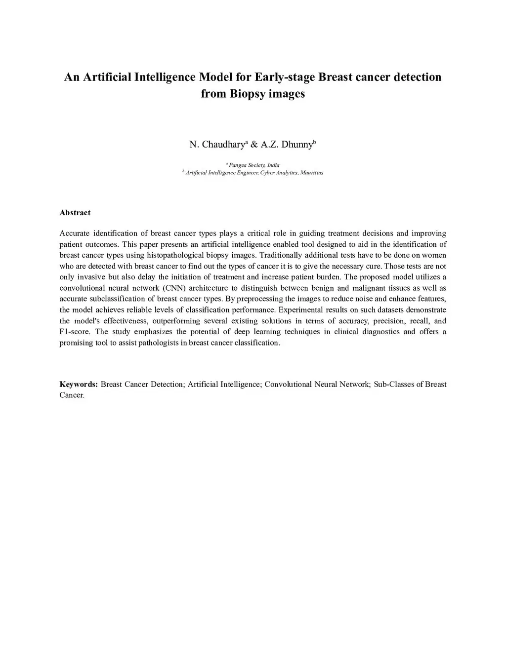 An Artificial Intelligence Model for Early Stage Breast Cancer Detection from Biopsy Images