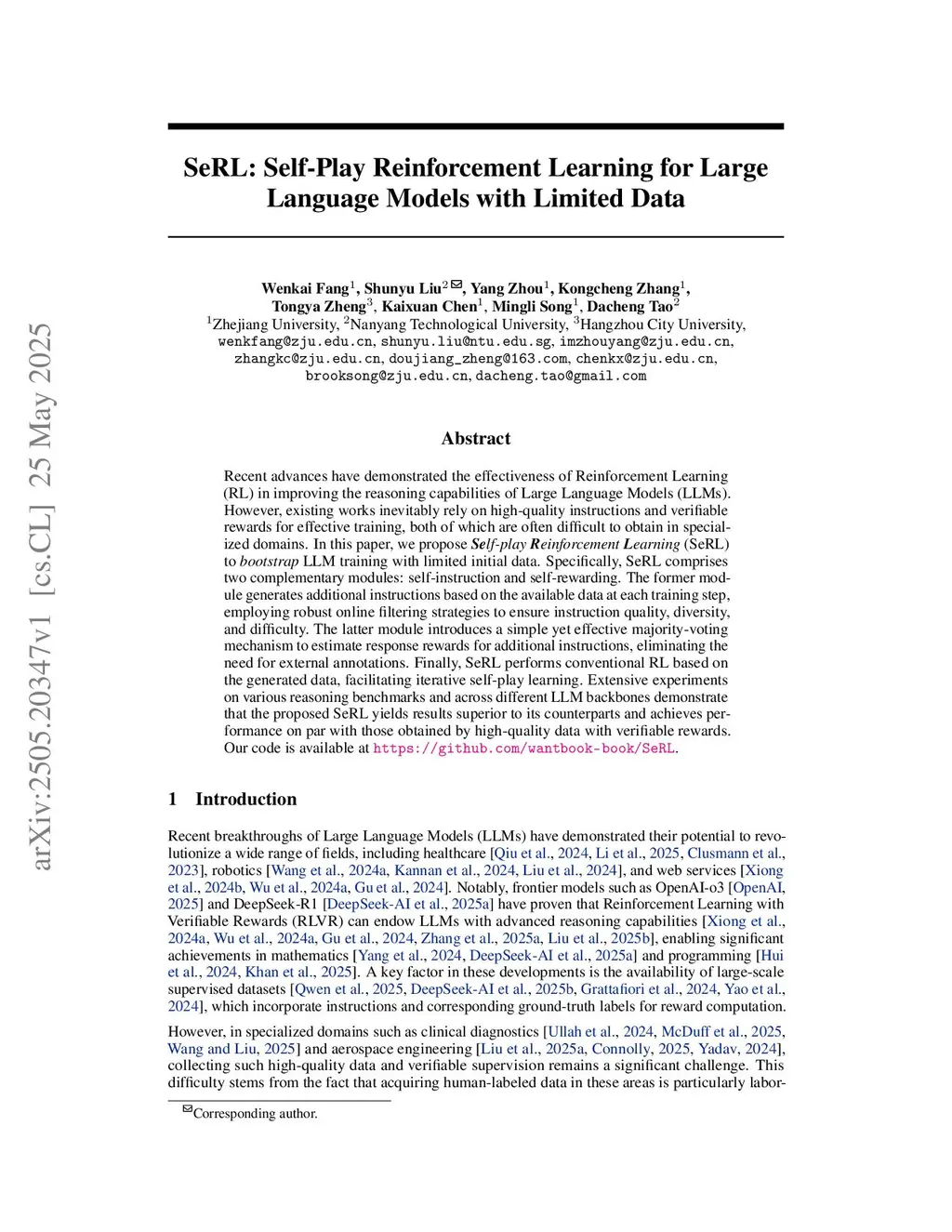 Recent advances have demonstrated the effectiveness of Reinforcement Learning (RL) in improving the reasoning capabilities of Large Language Models (LLMs). However, existing works inevitably rely on high-quality instructions and verifiable rewards for effective training, both of which are often difficult to obtain in specialized domains. In this paper, we propose Self-play Reinforcement Learning (SeRL) to bootstrap LLM training with limited initial data. Specifically, SeRL comprises two complementary modules: self-instruction and self-rewarding. The former module generates additional instructions based on the available data at each training step, employing robust online filtering strategies to ensure instruction quality, diversity, and difficulty. The latter module introduces a simple yet effective majority-voting mechanism to estimate response rewards for additional instructions, eliminating the need for external annotations. Finally, SeRL performs conventional RL based on the generated data, facilitating iterative self-play learning. Extensive experiments on various reasoning benchmarks and across different LLM backbones demonstrate that the proposed SeRL yields results superior to its counterparts and achieves performance on par with those obtained by high-quality data with verifiable rewards. Our code is available atthis https URL.