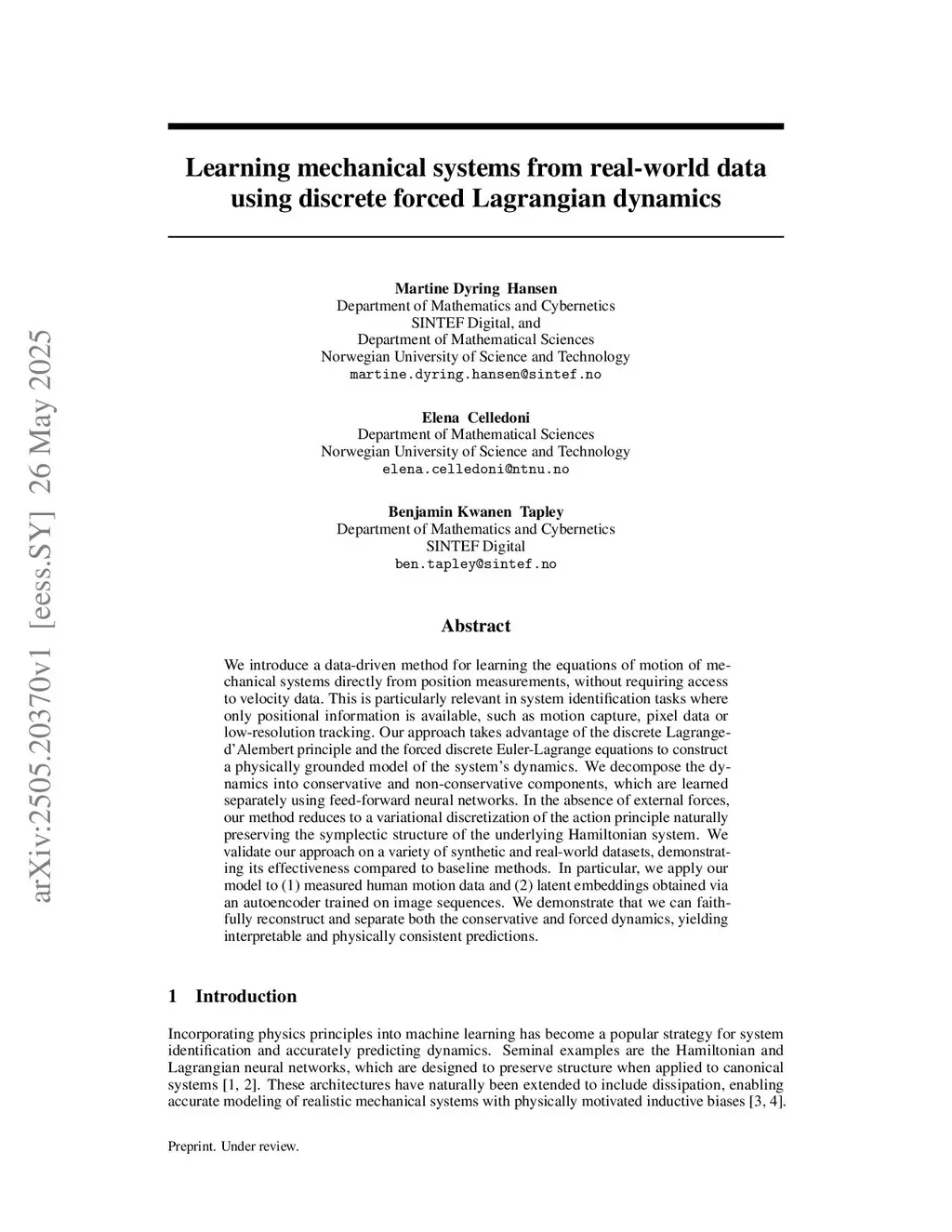 We introduce a data-driven method for learning the equations of motion of mechanical systems directly from position measurements, without requiring access to velocity data. This is particularly relevant in system identification tasks where only positional information is available, such as motion capture, pixel data or low-resolution tracking. Our approach takes advantage of the discrete Lagrange-dÁlembert principle and the forced discrete Euler-Lagrange equations to construct a physically grounded model of the system's dynamics. We decompose the dynamics into conservative and non-conservative components, which are learned separately using feed-forward neural networks. In the absence of external forces, our method reduces to a variational discretization of the action principle naturally preserving the symplectic structure of the underlying Hamiltonian system. We validate our approach on a variety of synthetic and real-world datasets, demonstrating its effectiveness compared to baseline methods. In particular, we apply our model to (1) measured human motion data and (2) latent embeddings obtained via an autoencoder trained on image sequences. We demonstrate that we can faithfully reconstruct and separate both the conservative and forced dynamics, yielding interpretable and physically consistent predictions.