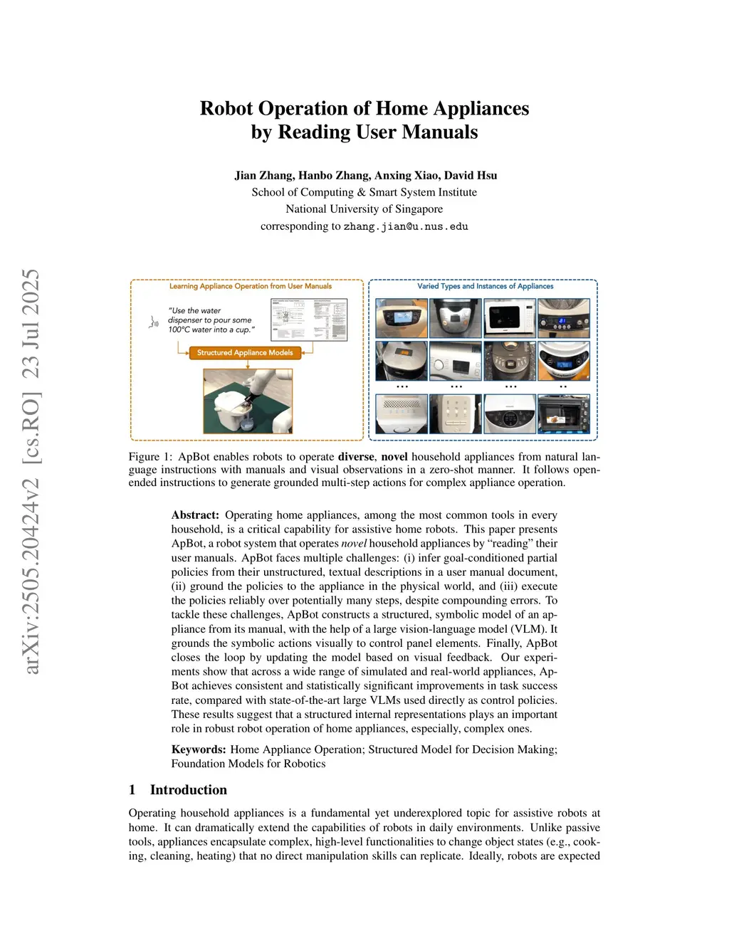 Operating home appliances, among the most common tools in every household, is a critical capability for assistive home robots. This paper presents ApBot, a robot system that operates novel household appliances by "reading" their user manuals. ApBot faces multiple challenges: (i) infer goal-conditioned partial policies from their unstructured, textual descriptions in a user manual document, (ii) ground the policies to the appliance in the physical world, and (iii) execute the policies reliably over potentially many steps, despite compounding errors. To tackle these challenges, ApBot constructs a structured, symbolic model of an appliance from its manual, with the help of a large vision-language model (VLM). It grounds the symbolic actions visually to control panel elements. Finally, ApBot closes the loop by updating the model based on visual feedback. Our experiments show that across a wide range of simulated and real-world appliances, ApBot achieves consistent and statistically significant improvements in task success rate, compared with state-of-the-art large VLMs used directly as control policies. These results suggest that a structured internal representations plays an important role in robust robot operation of home appliances, especially, complex ones.