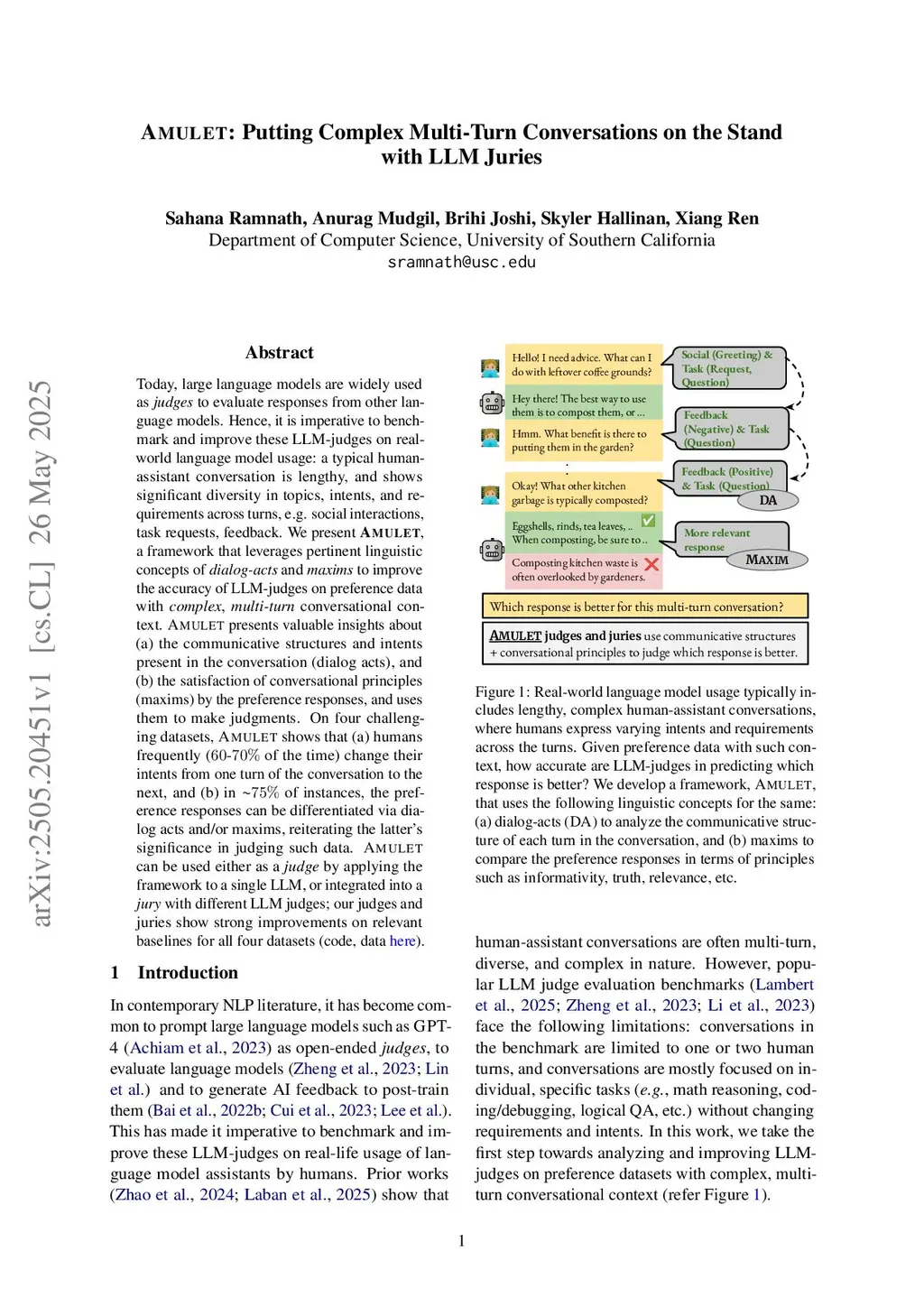 Today, large language models are widely used as judges to evaluate responses from other language models. Hence, it is imperative to benchmark and improve these LLM-judges on real-world language model usage: a typical human-assistant conversation is lengthy, and shows significant diversity in topics, intents, and requirements across turns, e.g. social interactions, task requests, feedback. We present Amulet, a framework that leverages pertinent linguistic concepts of dialog-acts and maxims to improve the accuracy of LLM-judges on preference data with complex, multi-turn conversational context. Amulet presents valuable insights about (a) the communicative structures and intents present in the conversation (dialog acts), and (b) the satisfaction of conversational principles (maxims) by the preference responses, and uses them to make judgments. On four challenging datasets, Amulet shows that (a) humans frequently (60 to 70 percent of the time) change their intents from one turn of the conversation to the next, and (b) in 75 percent of instances, the preference responses can be differentiated via dialog acts and/or maxims, reiterating the latter's significance in judging such data. Amulet can be used either as a judge by applying the framework to a single LLM, or integrated into a jury with different LLM judges; our judges and juries show strong improvements on relevant baselines for all four datasets.