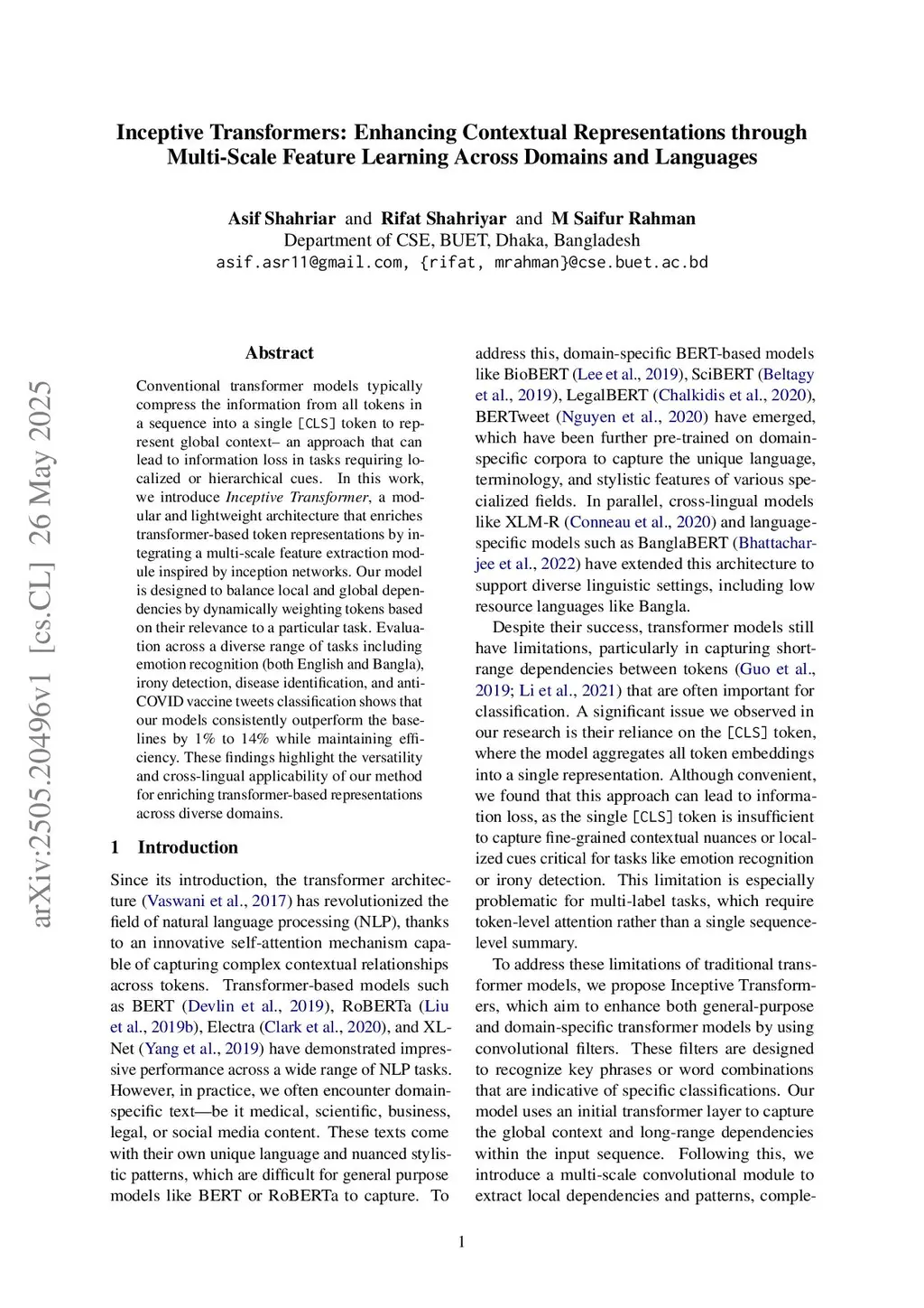Inceptive Transformers: Enhancing Contextual Representations through Multi-Scale Feature Learning Across Domains and Languages