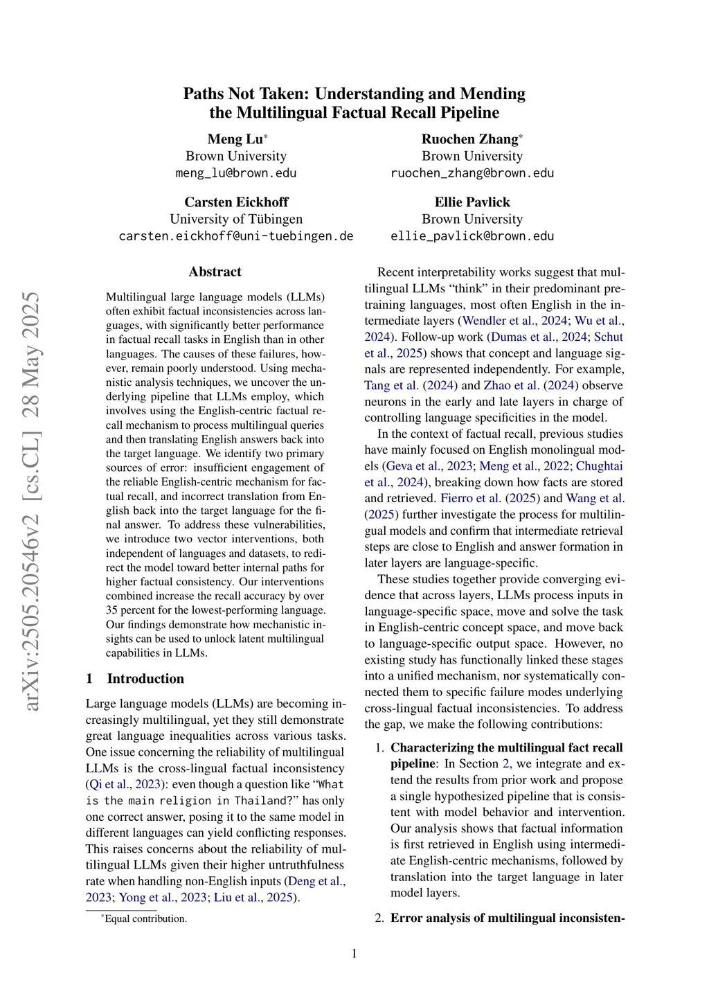 Multilingual large language models (LLMs) often exhibit factual inconsistencies across languages, with significantly better performance in factual recall tasks in English than in other languages. The causes of these failures, however, remain poorly understood. Using mechanistic analysis techniques, we uncover the underlying pipeline that LLMs employ, which involves using the English-centric factual recall mechanism to process multilingual queries and then translating English answers back into the target language. We identify two primary sources of error: insufficient engagement of the reliable English-centric mechanism for factual recall, and incorrect translation from English back into the target language for the final answer. To address these vulnerabilities, we introduce two vector interventions, both independent of languages and datasets, to redirect the model toward better internal paths for higher factual consistency. Our interventions combined increase the recall accuracy by over 35 percent for the lowest-performing language. Our findings demonstrate how mechanistic insights can be used to unlock latent multilingual capabilities in LLMs.