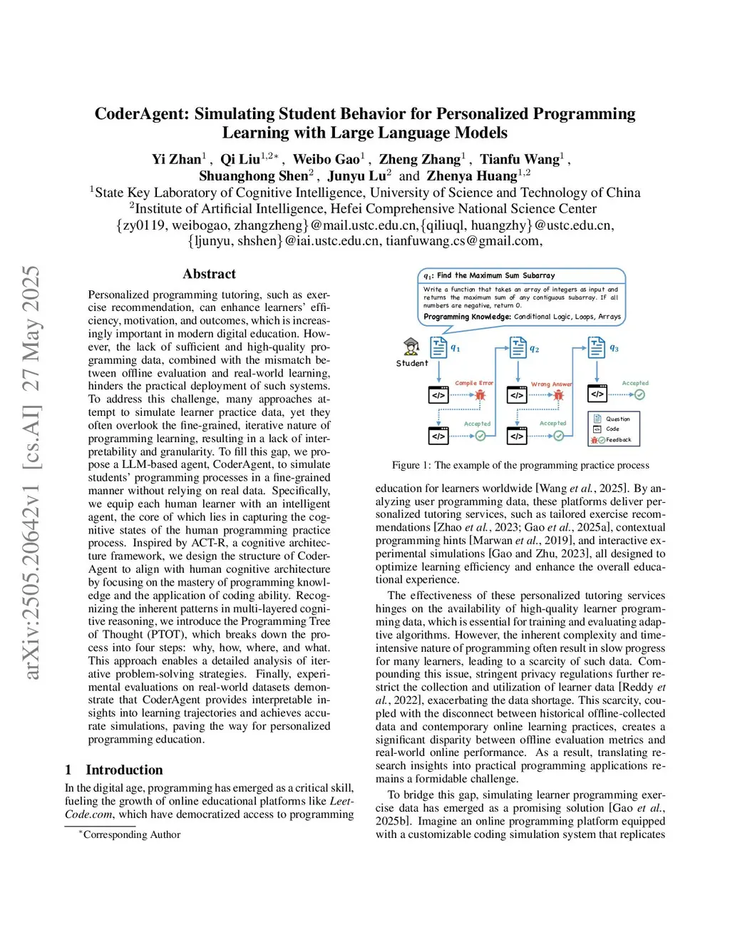 Personalized programming tutoring, such as exercise recommendation, can enhance learners' efficiency, motivation, and outcomes, which is increasingly important in modern digital education. However, the lack of sufficient and high-quality programming data, combined with the mismatch between offline evaluation and real-world learning, hinders the practical deployment of such systems. To address this challenge, many approaches attempt to simulate learner practice data, yet they often overlook the fine-grained, iterative nature of programming learning, resulting in a lack of interpretability and granularity. To fill this gap, we propose a LLM-based agent, CoderAgent, to simulate students' programming processes in a fine-grained manner without relying on real data. Specifically, we equip each human learner with an intelligent agent, the core of which lies in capturing the cognitive states of the human programming practice process. Inspired by ACT-R, a cognitive architecture framework, we design the structure of CoderAgent to align with human cognitive architecture by focusing on the mastery of programming knowledge and the application of coding ability. Recognizing the inherent patterns in multi-layered cognitive reasoning, we introduce the Programming Tree of Thought (PTOT), which breaks down the process into four steps: why, how, where, and what. This approach enables a detailed analysis of iterative problem-solving strategies. Finally, experimental evaluations on real-world datasets demonstrate that CoderAgent provides interpretable insights into learning trajectories and achieves accurate simulations, paving the way for personalized programming education.