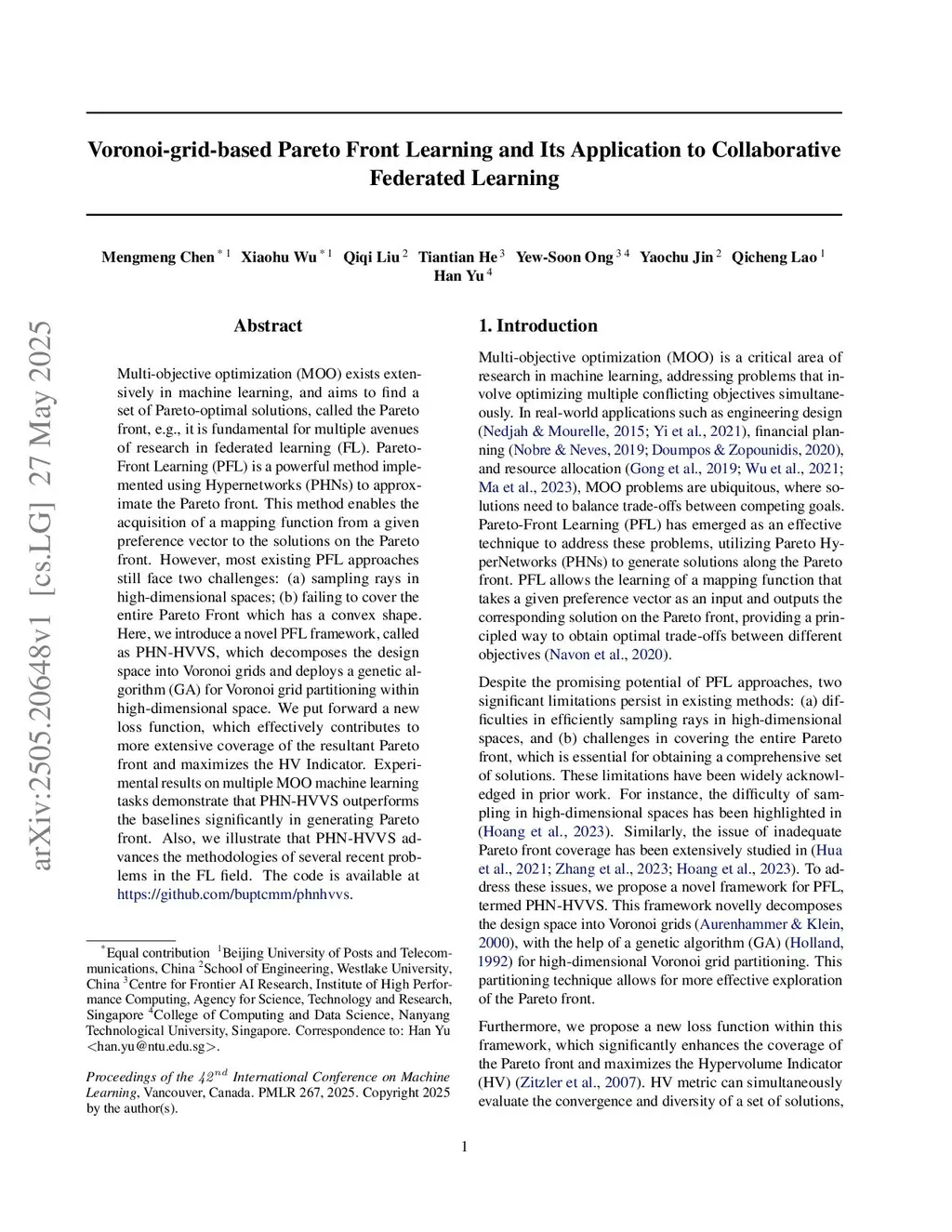 Multi-objective optimization (MOO) exists extensively in machine learning, and aims to find a set of Pareto-optimal solutions, called the Pareto front, e.g., it is fundamental for multiple avenues of research in federated learning (FL). Pareto-Front Learning (PFL) is a powerful method implemented using Hypernetworks (PHNs) to approximate the Pareto front. This method enables the acquisition of a mapping function from a given preference vector to the solutions on the Pareto front. However, most existing PFL approaches still face two challenges: (a) sampling rays in high-dimensional spaces; (b) failing to cover the entire Pareto Front which has a convex shape. Here, we introduce a novel PFL framework, called as PHN-HVVS, which decomposes the design space into Voronoi grids and deploys a genetic algorithm (GA) for Voronoi grid partitioning within high-dimensional space. We put forward a new loss function, which effectively contributes to more extensive coverage of the resultant Pareto front and maximizes the HV Indicator. Experimental results on multiple MOO machine learning tasks demonstrate that PHN-HVVS outperforms the baselines significantly in generating Pareto front. Also, we illustrate that PHN-HVVS advances the methodologies of several recent problems in the FL field. The code is available atthis https URL}{this https URL.
