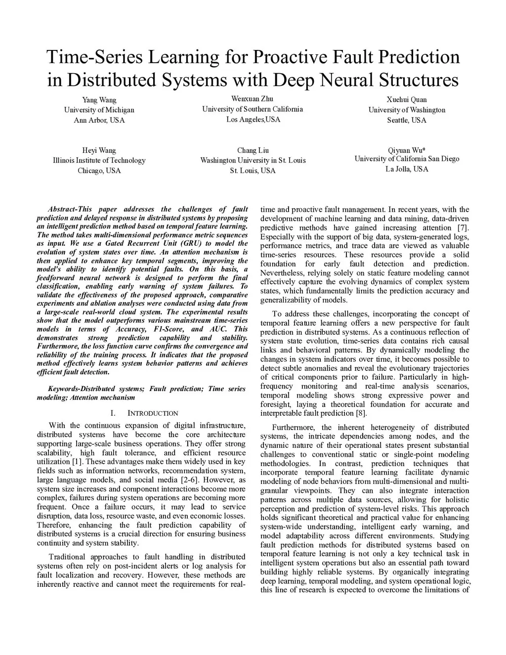 This paper addresses the challenges of fault prediction and delayed response in distributed systems by proposing an intelligent prediction method based on temporal feature learning. The method takes multi-dimensional performance metric sequences as input. We use a Gated Recurrent Unit (GRU) to model the evolution of system states over time. An attention mechanism is then applied to enhance key temporal segments, improving the model's ability to identify potential faults. On this basis, a feedforward neural network is designed to perform the final classification, enabling early warning of system failures. To validate the effectiveness of the proposed approach, comparative experiments and ablation analyses were conducted using data from a large-scale real-world cloud system. The experimental results show that the model outperforms various mainstream time-series models in terms of Accuracy, F1-Score, and AUC. This demonstrates strong prediction capability and stability. Furthermore, the loss function curve confirms the convergence and reliability of the training process. It indicates that the proposed method effectively learns system behavior patterns and achieves efficient fault detection.
