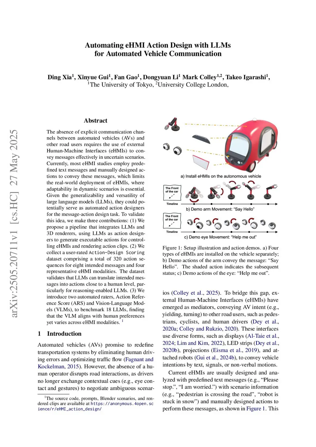 The absence of explicit communication channels between automated vehicles (AVs) and other road users requires the use of external Human-Machine Interfaces (eHMIs) to convey messages effectively in uncertain scenarios. Currently, most eHMI studies employ predefined text messages and manually designed actions to perform these messages, which limits the real-world deployment of eHMIs, where adaptability in dynamic scenarios is essential. Given the generalizability and versatility of large language models (LLMs), they could potentially serve as automated action designers for the message-action design task. To validate this idea, we make three contributions: (1) We propose a pipeline that integrates LLMs and 3D renderers, using LLMs as action designers to generate executable actions for controlling eHMIs and rendering action clips. (2) We collect a user-rated Action-Design Scoring dataset comprising a total of 320 action sequences for eight intended messages and four representative eHMI modalities. The dataset validates that LLMs can translate intended messages into actions close to a human level, particularly for reasoning-enabled LLMs. (3) We introduce two automated raters, Action Reference Score (ARS) and Vision-Language Models (VLMs), to benchmark 18 LLMs, finding that the VLM aligns with human preferences yet varies across eHMI modalities.