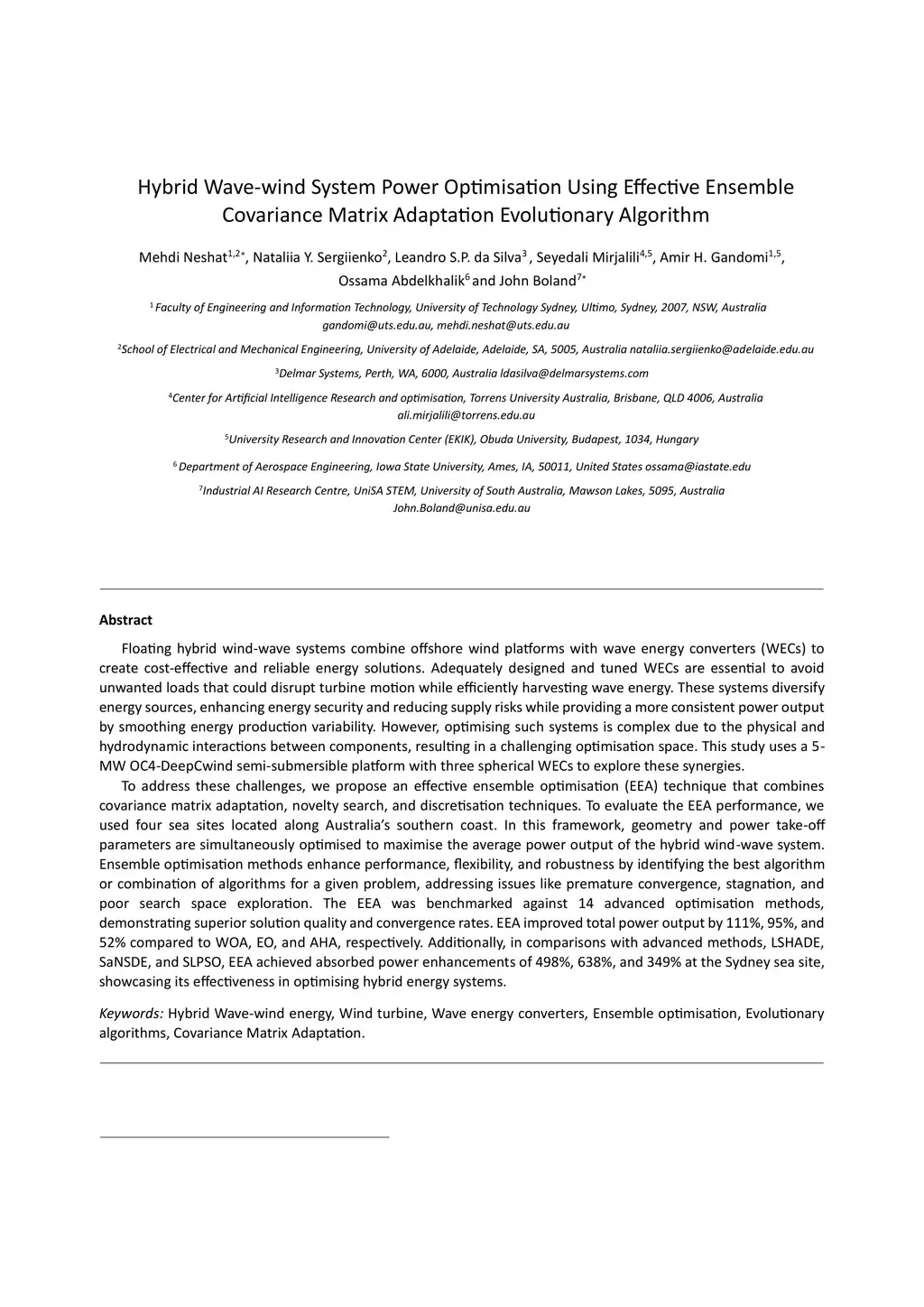 Hybrid Wave-wind System Power Optimisation Using Effective Ensemble Covariance Matrix Adaptation Evolutionary Algorithm