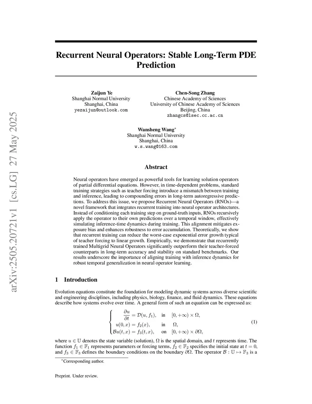 Neural operators have emerged as powerful tools for learning solution operators of partial differential equations. However, in time-dependent problems, standard training strategies such as teacher forcing introduce a mismatch between training and inference, leading to compounding errors in long-term autoregressive predictions. To address this issue, we propose Recurrent Neural Operators (RNOs)-a novel framework that integrates recurrent training into neural operator architectures. Instead of conditioning each training step on ground-truth inputs, RNOs recursively apply the operator to their own predictions over a temporal window, effectively simulating inference-time dynamics during training. This alignment mitigates exposure bias and enhances robustness to error accumulation. Theoretically, we show that recurrent training can reduce the worst-case exponential error growth typical of teacher forcing to linear growth. Empirically, we demonstrate that recurrently trained Multigrid Neural Operators significantly outperform their teacher-forced counterparts in long-term accuracy and stability on standard benchmarks. Our results underscore the importance of aligning training with inference dynamics for robust temporal generalization in neural operator learning.