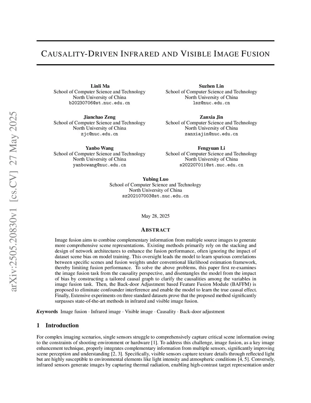 Image fusion aims to combine complementary information from multiple source images to generate more comprehensive scene representations. Existing methods primarily rely on the stacking and design of network architectures to enhance the fusion performance, often ignoring the impact of dataset scene bias on model training. This oversight leads the model to learn spurious correlations between specific scenes and fusion weights under conventional likelihood estimation framework, thereby limiting fusion performance. To solve the above problems, this paper first re-examines the image fusion task from the causality perspective, and disentangles the model from the impact of bias by constructing a tailored causal graph to clarify the causalities among the variables in image fusion task. Then, the Back-door Adjustment based Feature Fusion Module (BAFFM) is proposed to eliminate confounder interference and enable the model to learn the true causal effect. Finally, Extensive experiments on three standard datasets prove that the proposed method significantly surpasses state-of-the-art methods in infrared and visible image fusion.