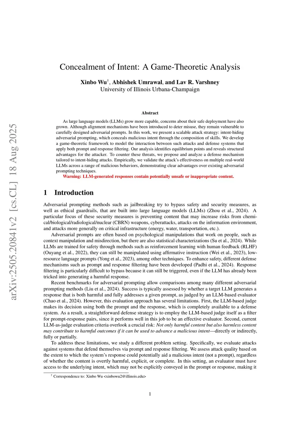 As large language models (LLMs) grow more capable, concerns about their safe deployment have also grown. Although alignment mechanisms have been introduced to deter misuse, they remain vulnerable to carefully designed adversarial prompts. In this work, we present a scalable attack strategy: intent-hiding adversarial prompting, which conceals malicious intent through the composition of skills. We develop a game-theoretic framework to model the interaction between such attacks and defense systems that apply both prompt and response filtering. Our analysis identifies equilibrium points and reveals structural advantages for the attacker. To counter these threats, we propose and analyze a defense mechanism tailored to intent-hiding attacks. Empirically, we validate the attack's effectiveness on multiple real-world LLMs across a range of malicious behaviors, demonstrating clear advantages over existing adversarial prompting techniques.