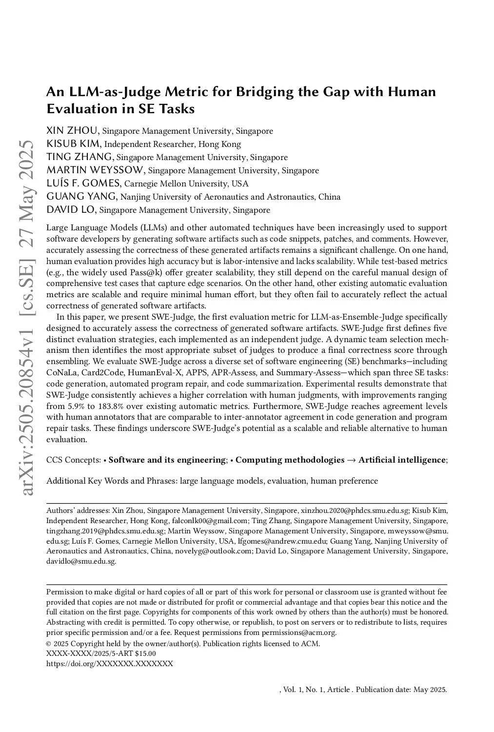 An LLM-as-Judge Metric for Bridging the Gap with Human Evaluation in SE Tasks