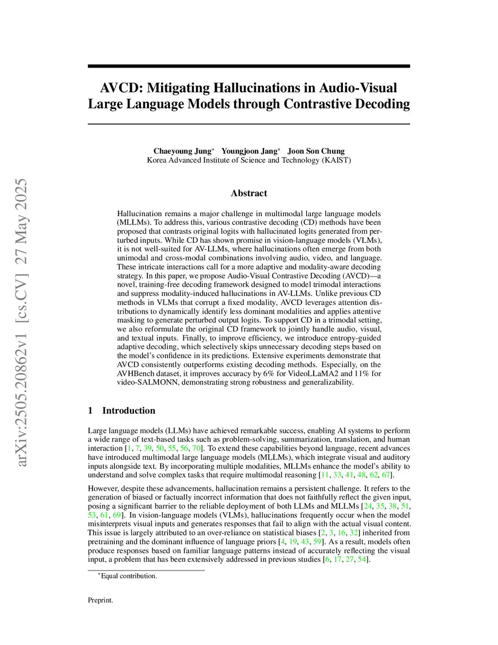 Hallucination remains a major challenge in multimodal large language models (MLLMs). To address this, various contrastive decoding (CD) methods have been proposed that contrasts original logits with hallucinated logits generated from perturbed inputs. While CD has shown promise in vision-language models (VLMs), it is not well-suited for AV-LLMs, where hallucinations often emerge from both unimodal and cross-modal combinations involving audio, video, and language. These intricate interactions call for a more adaptive and modality-aware decoding strategy. In this paper, we propose Audio-Visual Contrastive Decoding (AVCD)-a novel, training-free decoding framework designed to model trimodal interactions and suppress modality-induced hallucinations in AV-LLMs. Unlike previous CD methods in VLMs that corrupt a fixed modality, AVCD leverages attention distributions to dynamically identify less dominant modalities and applies attentive masking to generate perturbed output logits. To support CD in a trimodal setting, we also reformulate the original CD framework to jointly handle audio, visual, and textual inputs. Finally, to improve efficiency, we introduce entropy-guided adaptive decoding, which selectively skips unnecessary decoding steps based on the model's confidence in its predictions. Extensive experiments demonstrate that AVCD consistently outperforms existing decoding methods. Especially, on the AVHBench dataset, it improves accuracy by 2% for VideoLLaMA2 and 7% for video-SALMONN, demonstrating strong robustness and generalizability. Our code is available atthis https URL.