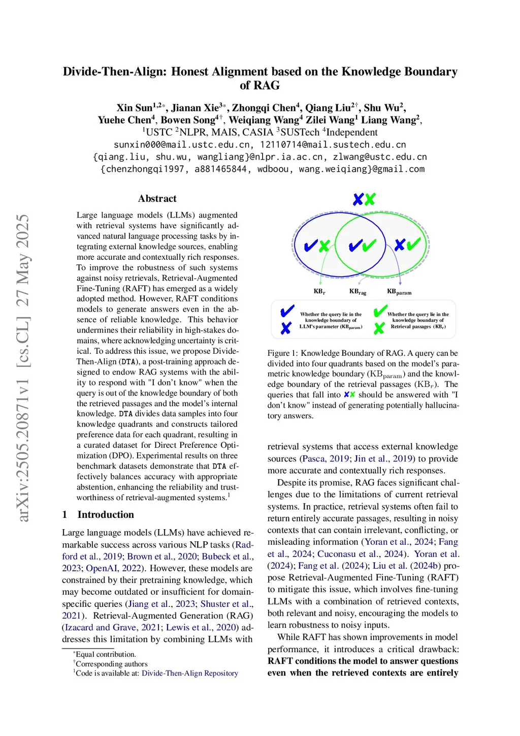 Large language models (LLMs) augmented with retrieval systems have significantly advanced natural language processing tasks by integrating external knowledge sources, enabling more accurate and contextually rich responses. To improve the robustness of such systems against noisy retrievals, Retrieval-Augmented Fine-Tuning (RAFT) has emerged as a widely adopted method. However, RAFT conditions models to generate answers even in the absence of reliable knowledge. This behavior undermines their reliability in high-stakes domains, where acknowledging uncertainty is critical. To address this issue, we propose Divide-Then-Align (DTA), a post-training approach designed to endow RAG systems with the ability to respond with "I don't know" when the query is out of the knowledge boundary of both the retrieved passages and the model's internal knowledge. DTA divides data samples into four knowledge quadrants and constructs tailored preference data for each quadrant, resulting in a curated dataset for Direct Preference Optimization (DPO). Experimental results on three benchmark datasets demonstrate that DTA effectively balances accuracy with appropriate abstention, enhancing the reliability and trustworthiness of retrieval-augmented systems.