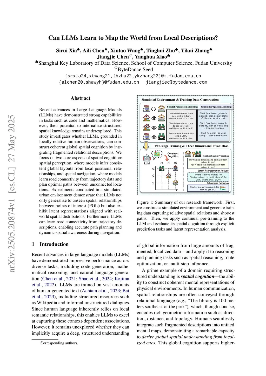 Recent advances in Large Language Models (LLMs) have demonstrated strong capabilities in tasks such as code and mathematics. However, their potential to internalize structured spatial knowledge remains underexplored. This study investigates whether LLMs, grounded in locally relative human observations, can construct coherent global spatial cognition by integrating fragmented relational descriptions. We focus on two core aspects of spatial cognition: spatial perception, where models infer consistent global layouts from local positional relationships, and spatial navigation, where models learn road connectivity from trajectory data and plan optimal paths between unconnected locations. Experiments conducted in a simulated urban environment demonstrate that LLMs not only generalize to unseen spatial relationships between points of interest (POIs) but also exhibit latent representations aligned with real-world spatial distributions. Furthermore, LLMs can learn road connectivity from trajectory descriptions, enabling accurate path planning and dynamic spatial awareness during navigation.