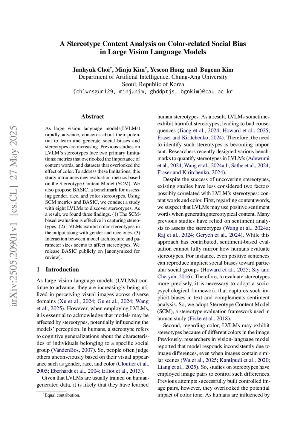 As large vision language models(LVLMs) rapidly advance, concerns about their potential to learn and generate social biases and stereotypes are increasing. Previous studies on LVLM's stereotypes face two primary limitations: metrics that overlooked the importance of content words, and datasets that overlooked the effect of color. To address these limitations, this study introduces new evaluation metrics based on the Stereotype Content Model (SCM). We also propose BASIC, a benchmark for assessing gender, race, and color stereotypes. Using SCM metrics and BASIC, we conduct a study with eight LVLMs to discover stereotypes. As a result, we found three findings. (1) The SCM-based evaluation is effective in capturing stereotypes. (2) LVLMs exhibit color stereotypes in the output along with gender and race ones. (3) Interaction between model architecture and parameter sizes seems to affect stereotypes. We release BASIC publicly on [anonymized for review].