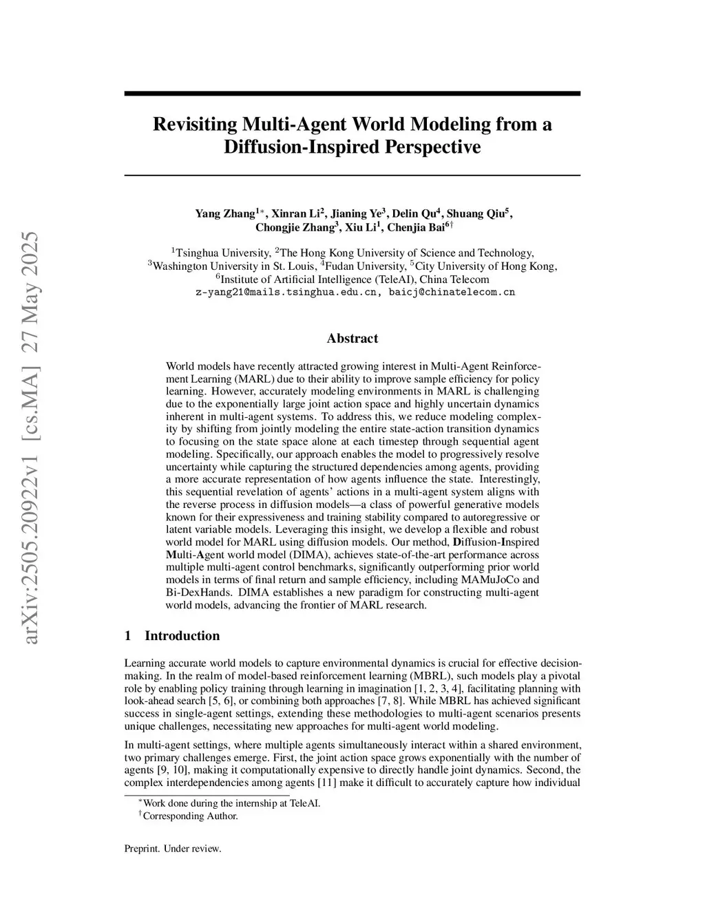World models have recently attracted growing interest in Multi-Agent Reinforcement Learning (MARL) due to their ability to improve sample efficiency for policy learning. However, accurately modeling environments in MARL is challenging due to the exponentially large joint action space and highly uncertain dynamics inherent in multi-agent systems. To address this, we reduce modeling complexity by shifting from jointly modeling the entire state-action transition dynamics to focusing on the state space alone at each timestep through sequential agent modeling. Specifically, our approach enables the model to progressively resolve uncertainty while capturing the structured dependencies among agents, providing a more accurate representation of how agents influence the state. Interestingly, this sequential revelation of agents' actions in a multi-agent system aligns with the reverse process in diffusion models--a class of powerful generative models known for their expressiveness and training stability compared to autoregressive or latent variable models. Leveraging this insight, we develop a flexible and robust world model for MARL using diffusion models. Our method, Diffusion-Inspired Multi-Agent world model (DIMA), achieves state-of-the-art performance across multiple multi-agent control benchmarks, significantly outperforming prior world models in terms of final return and sample efficiency, including MAMuJoCo and Bi-DexHands. DIMA establishes a new paradigm for constructing multi-agent world models, advancing the frontier of MARL research. Codes are open-sourced atthis https URL.