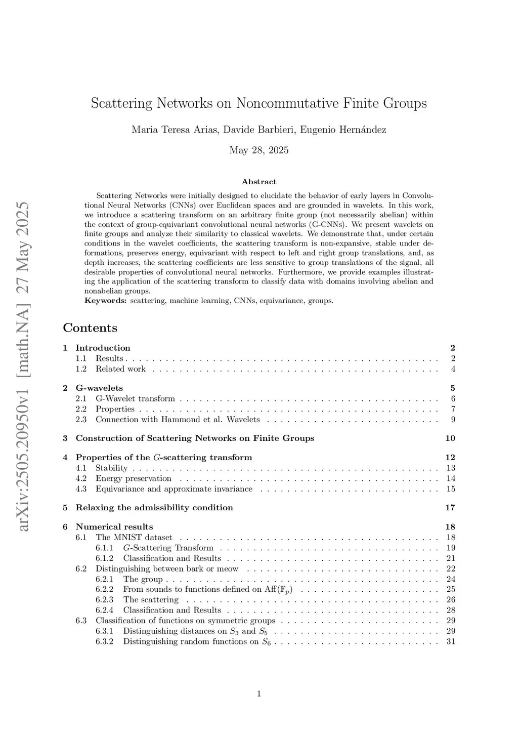 Scattering Networks were initially designed to elucidate the behavior of early layers in Convolutional Neural Networks (CNNs) over Euclidean spaces and are grounded in wavelets. In this work, we introduce a scattering transform on an arbitrary finite group (not necessarily abelian) within the context of group-equivariant convolutional neural networks (G-CNNs). We present wavelets on finite groups and analyze their similarity to classical wavelets. We demonstrate that, under certain conditions in the wavelet coefficients, the scattering transform is non-expansive, stable under deformations, preserves energy, equivariant with respect to left and right group translations, and, as depth increases, the scattering coefficients are less sensitive to group translations of the signal, all desirable properties of convolutional neural networks. Furthermore, we provide examples illustrating the application of the scattering transform to classify data with domains involving abelian and nonabelian groups.
