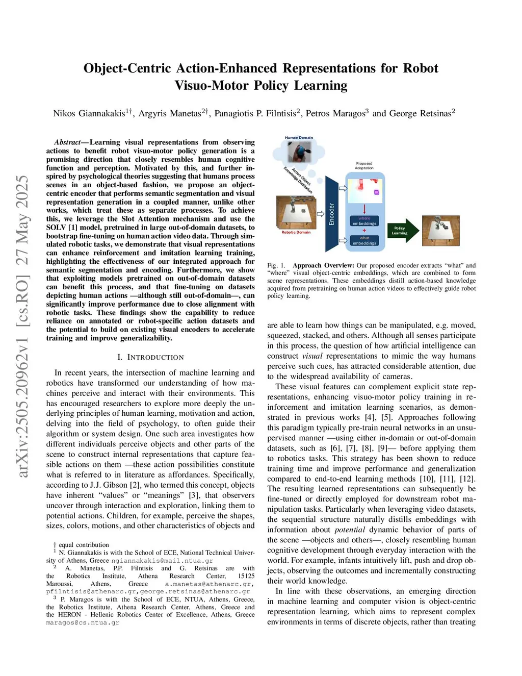 Learning visual representations from observing actions to benefit robot visuo-motor policy generation is a promising direction that closely resembles human cognitive function and perception. Motivated by this, and further inspired by psychological theories suggesting that humans process scenes in an object-based fashion, we propose an object-centric encoder that performs semantic segmentation and visual representation generation in a coupled manner, unlike other works, which treat these as separate processes. To achieve this, we leverage the Slot Attention mechanism and use the SOLV model, pretrained in large out-of-domain datasets, to bootstrap fine-tuning on human action video data. Through simulated robotic tasks, we demonstrate that visual representations can enhance reinforcement and imitation learning training, highlighting the effectiveness of our integrated approach for semantic segmentation and encoding. Furthermore, we show that exploiting models pretrained on out-of-domain datasets can benefit this process, and that fine-tuning on datasets depicting human actions -- although still out-of-domain -- , can significantly improve performance due to close alignment with robotic tasks. These findings show the capability to reduce reliance on annotated or robot-specific action datasets and the potential to build on existing visual encoders to accelerate training and improve generalizability.