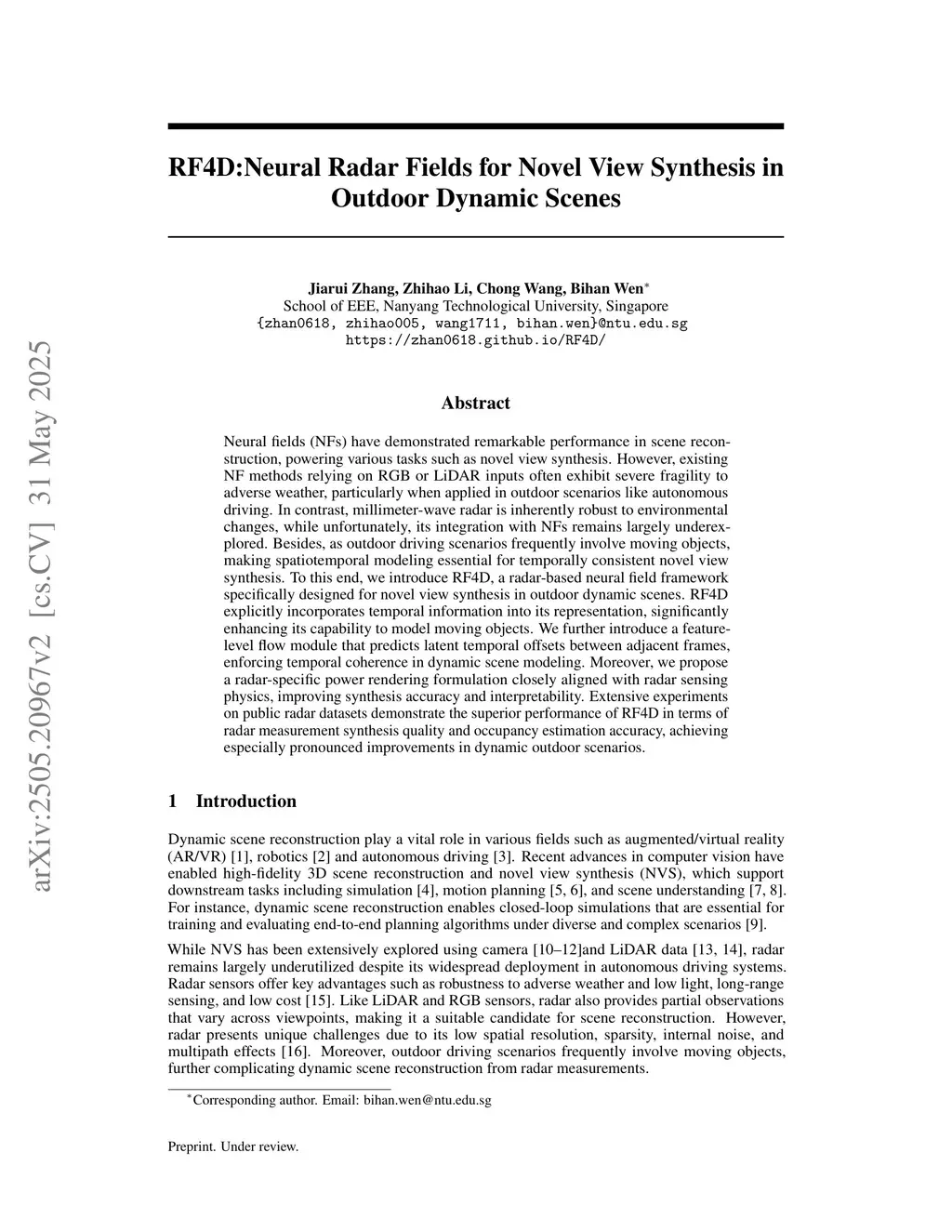 RF4D:Neural Radar Fields for Novel View Synthesis in Outdoor Dynamic Scenes